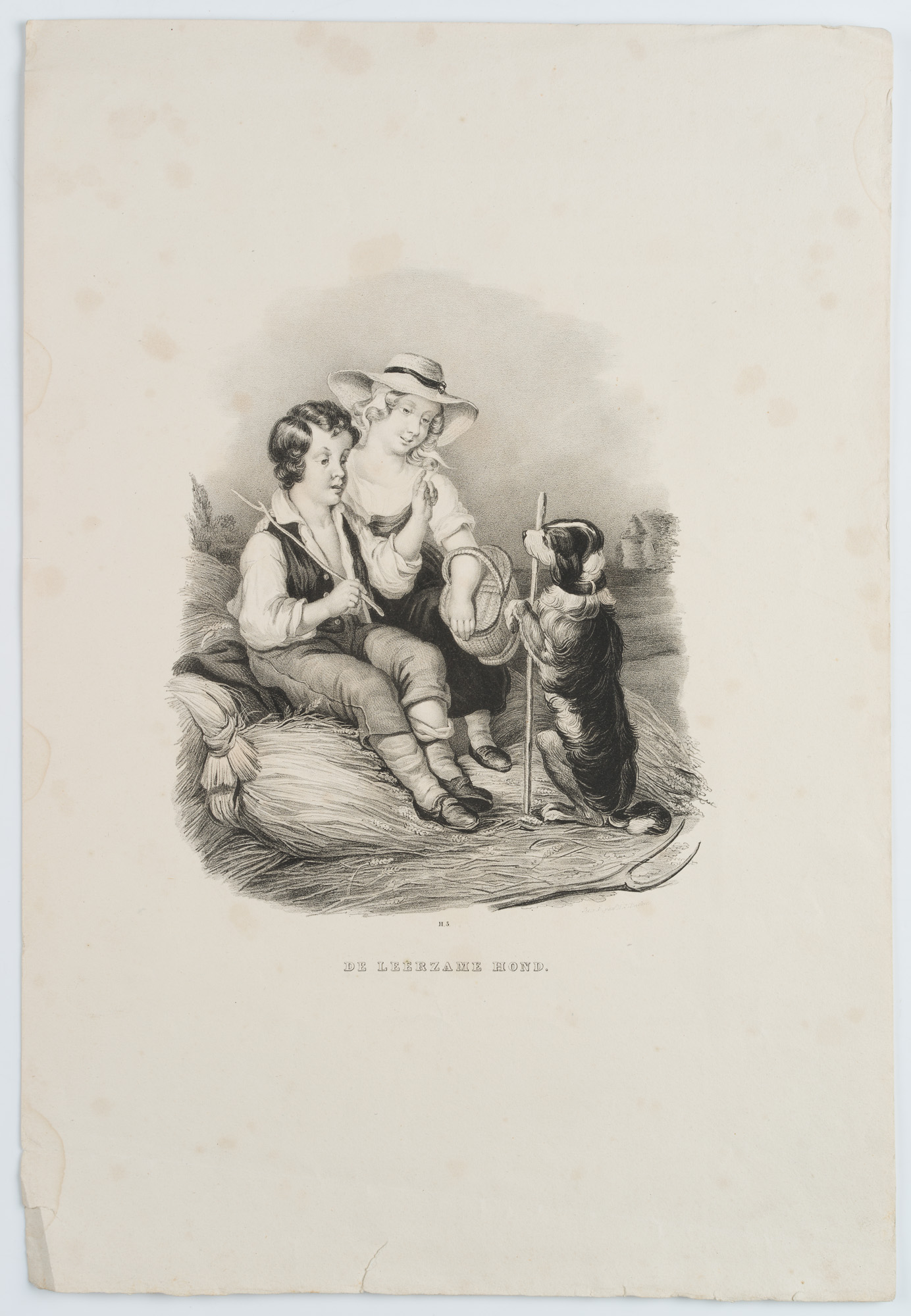 H. J. Backer (19th century), De leerzame Hond’, Rural scene with children on the straw playfully training a dog., c. 1840, Lithography