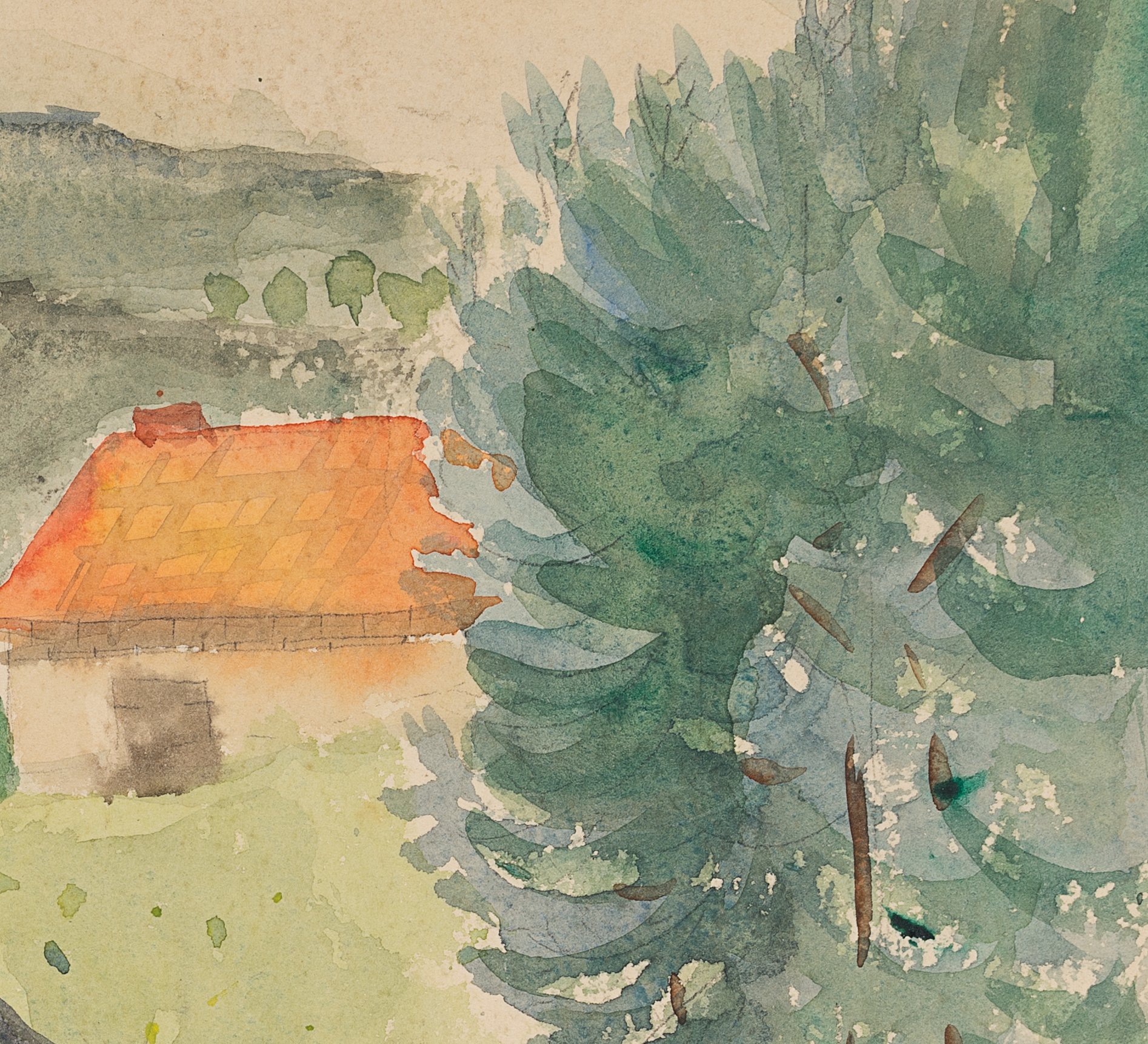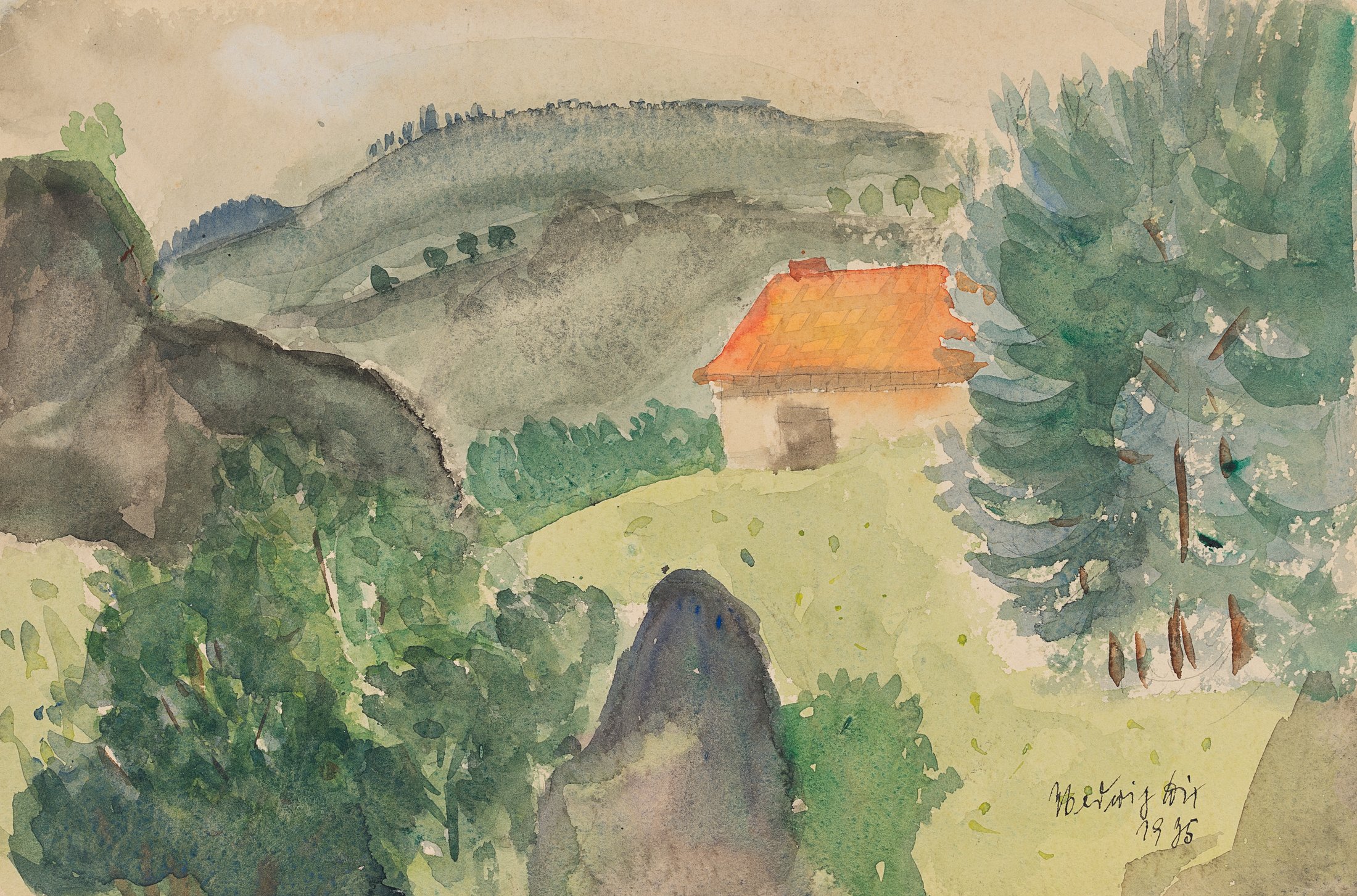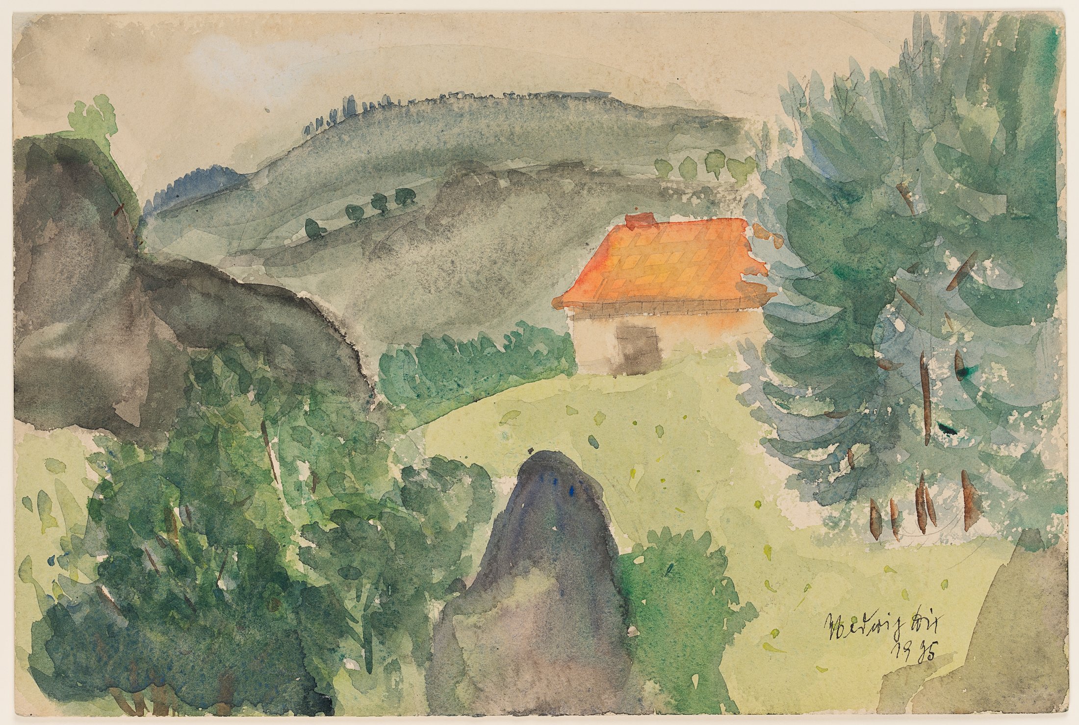 Hedwig Dix (1898 Untermhaus – 1980 Generate), Thuringian landscape with hut, 1935, Watercolor