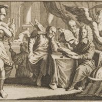 - Beschreibung: Die Illustration zeigt eine einflussreiche Person am Tisch sitzend und ein Buch unterzeichnend.