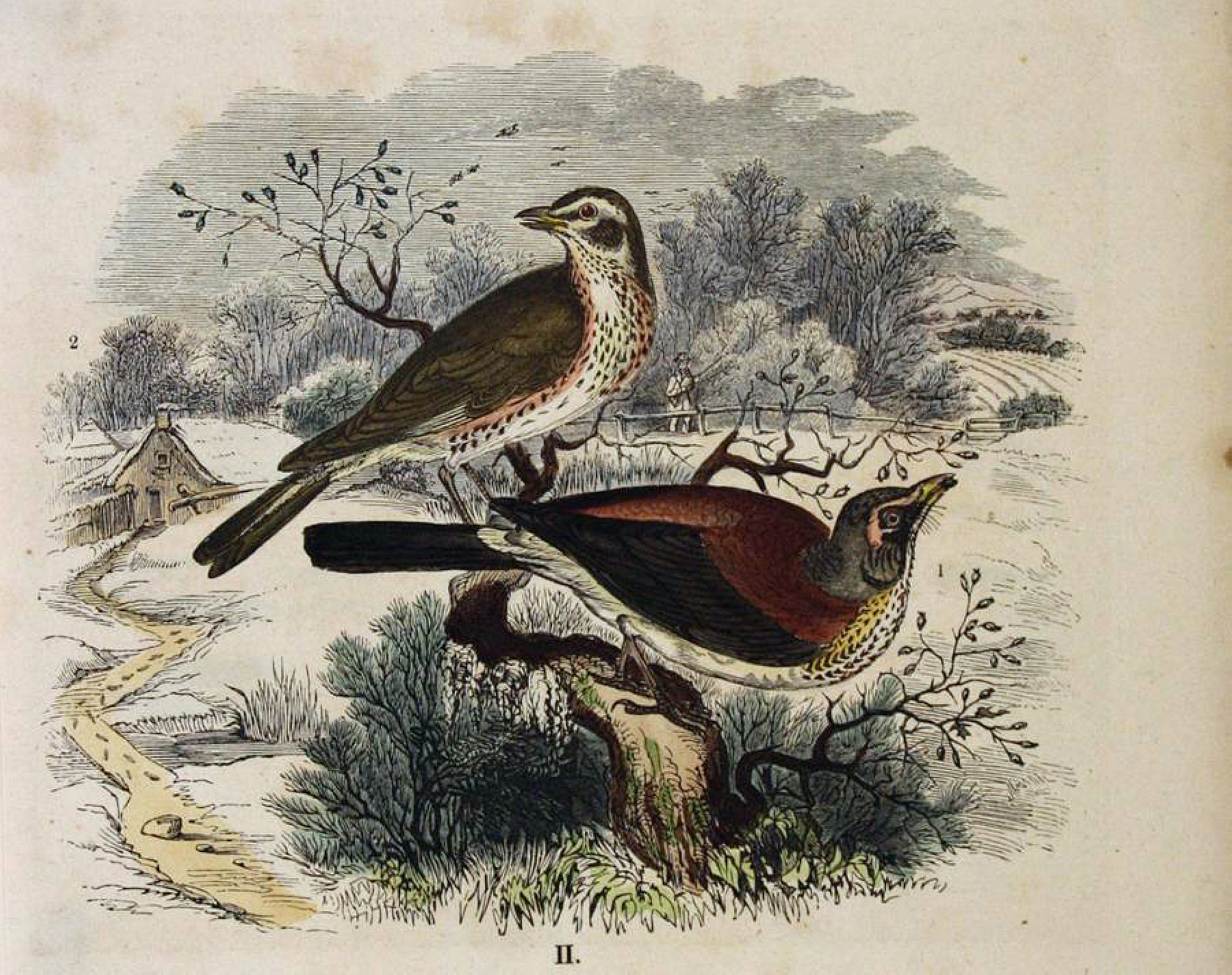 Hermann Frenz (19. Jahrhundert), Drosseln in winterlicher Landschaft, um 1920, Holzstich