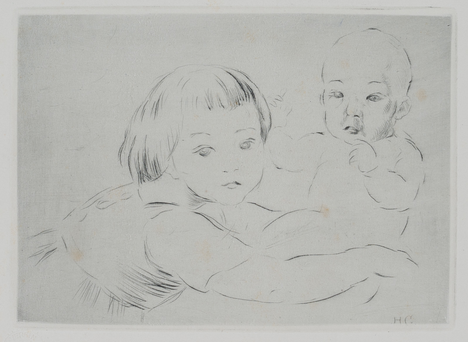 Hermann Geibel (1889 Freiburg im Breisgau – 1919 München), Die Kinder des Künstlers, Mädchen mit Geschwisterchen, 1920, Radierung