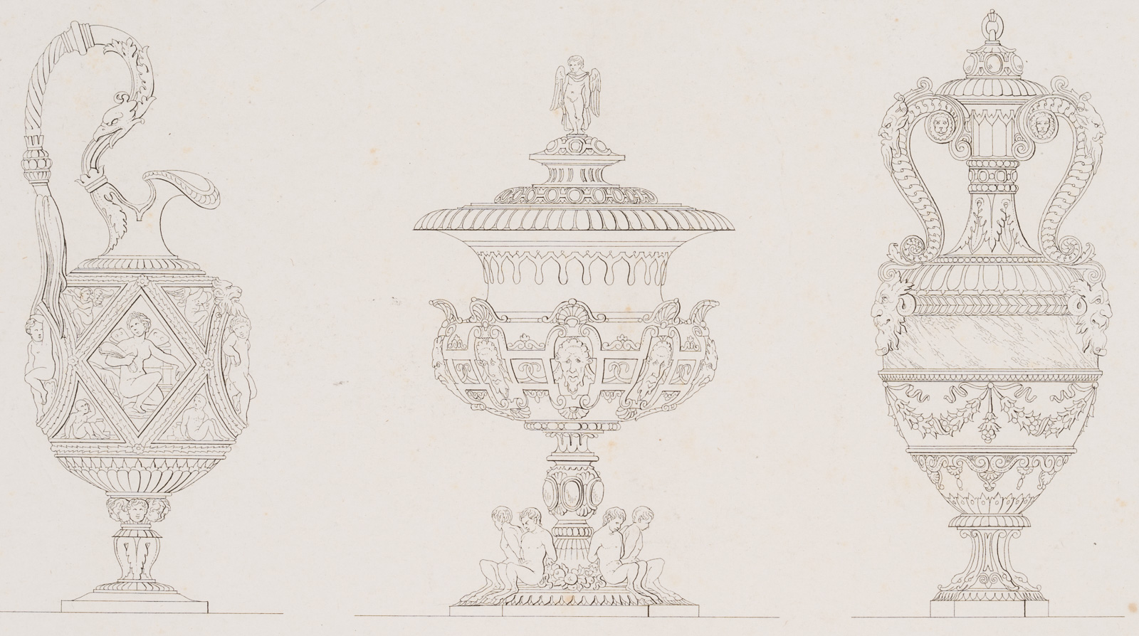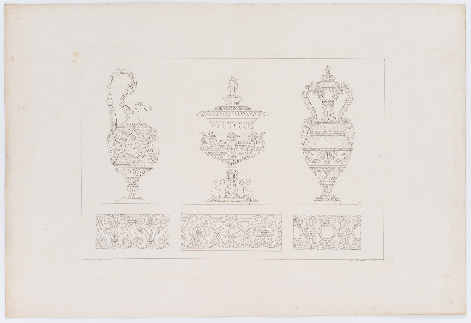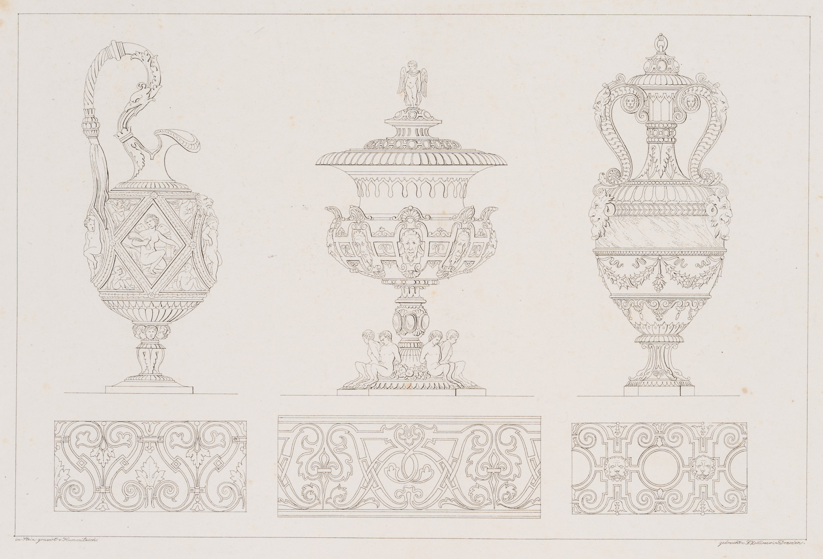 H. Hummitzsch (19. Jahrhundert), Entwurf von Trinkgefäßen. Deckelpokal, Kanne, verziert mit mythologischen Figuren, Löwenköpfen, Muscheln und Blätterranken, 19. Jahrhundert, Lithographie