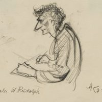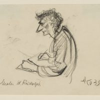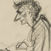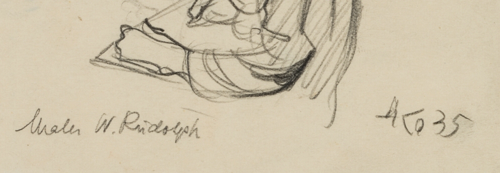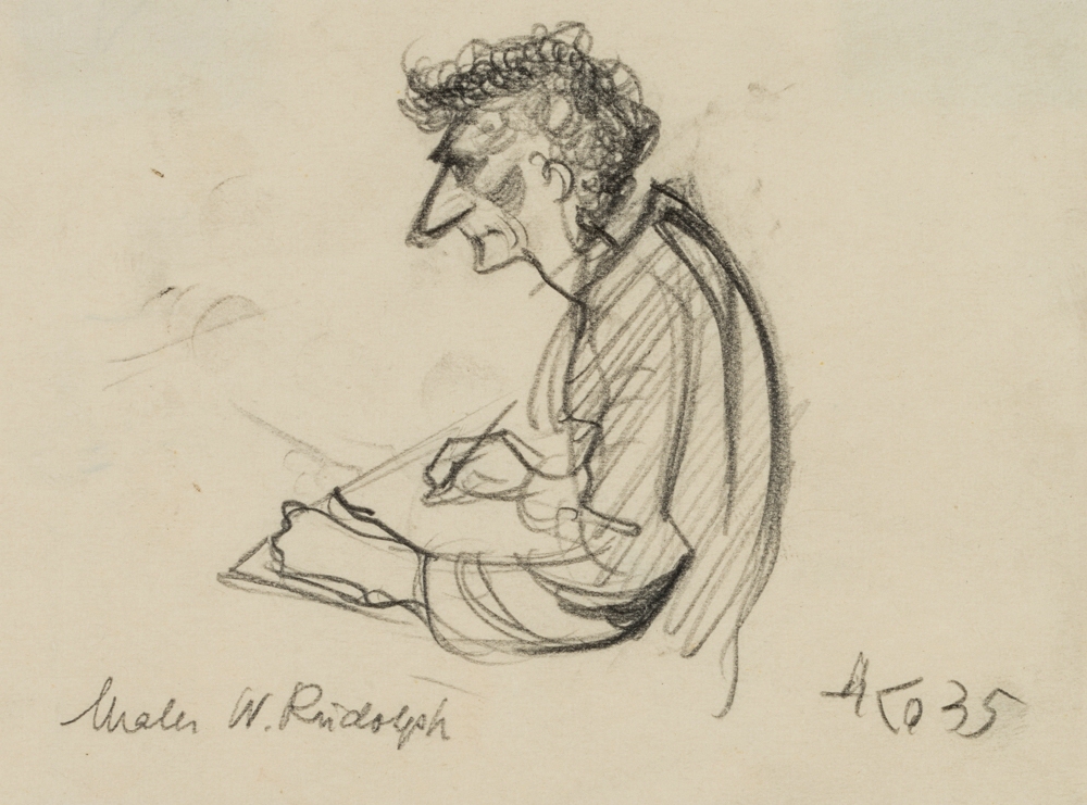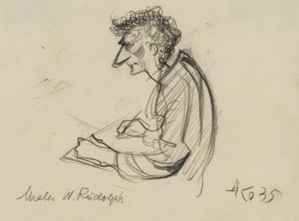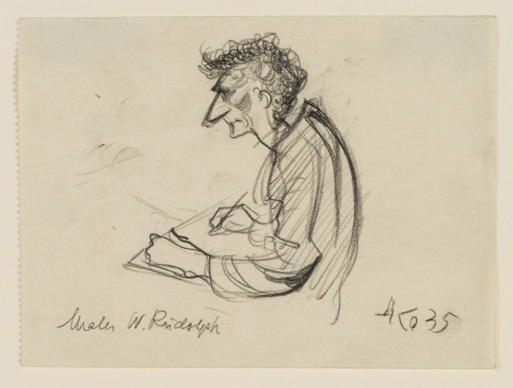 - Beschreibung: Mit schnellen Strichen skizziertes und minimal karikierendes Porträt des Künstlerfreundes Wilhelm Rudolph im Profil und über das Zeichenbrett gebeugt.