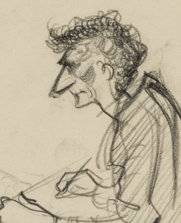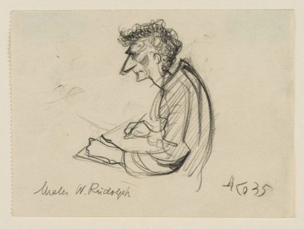 - Description: Portrait of the artist’s friend Wilhelm Rudolph, sketched with quick strokes and minimally caricatured, in profile and bent over the drawing board.
