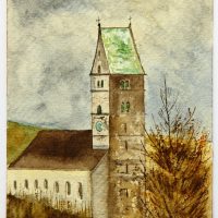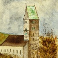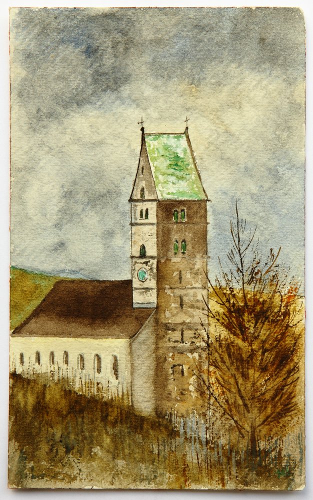 Helene Kraft (1879 Elsass – 1934 ), Ansicht der Stadtpfarrkirche Meersburg am Bodensee, , Aquarell