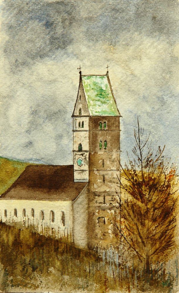 Helene Kraft (1879 Alsace – 1934 ), View of the town parish church of Meersburg on Lake Constance, , Watercolor