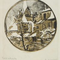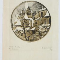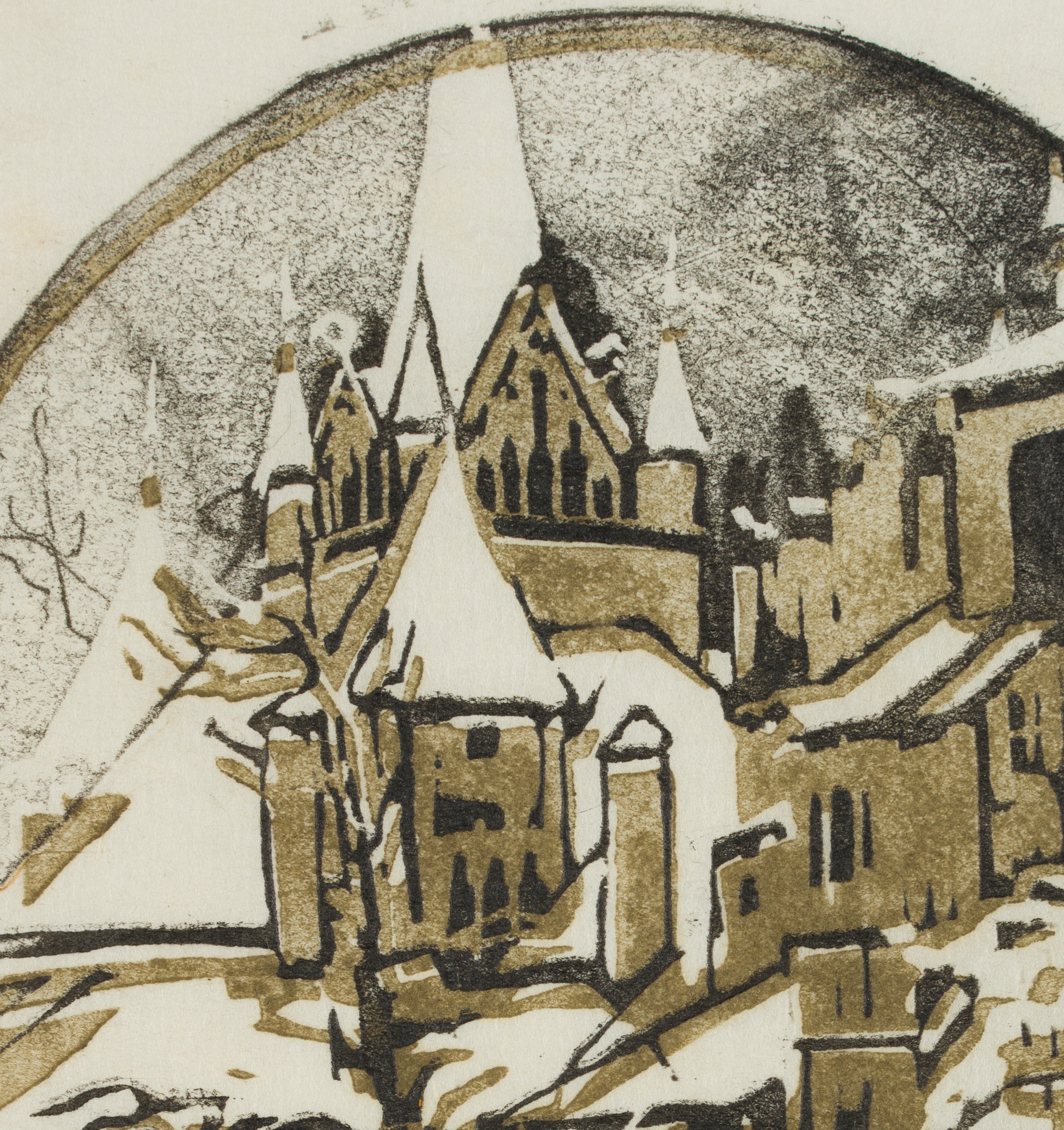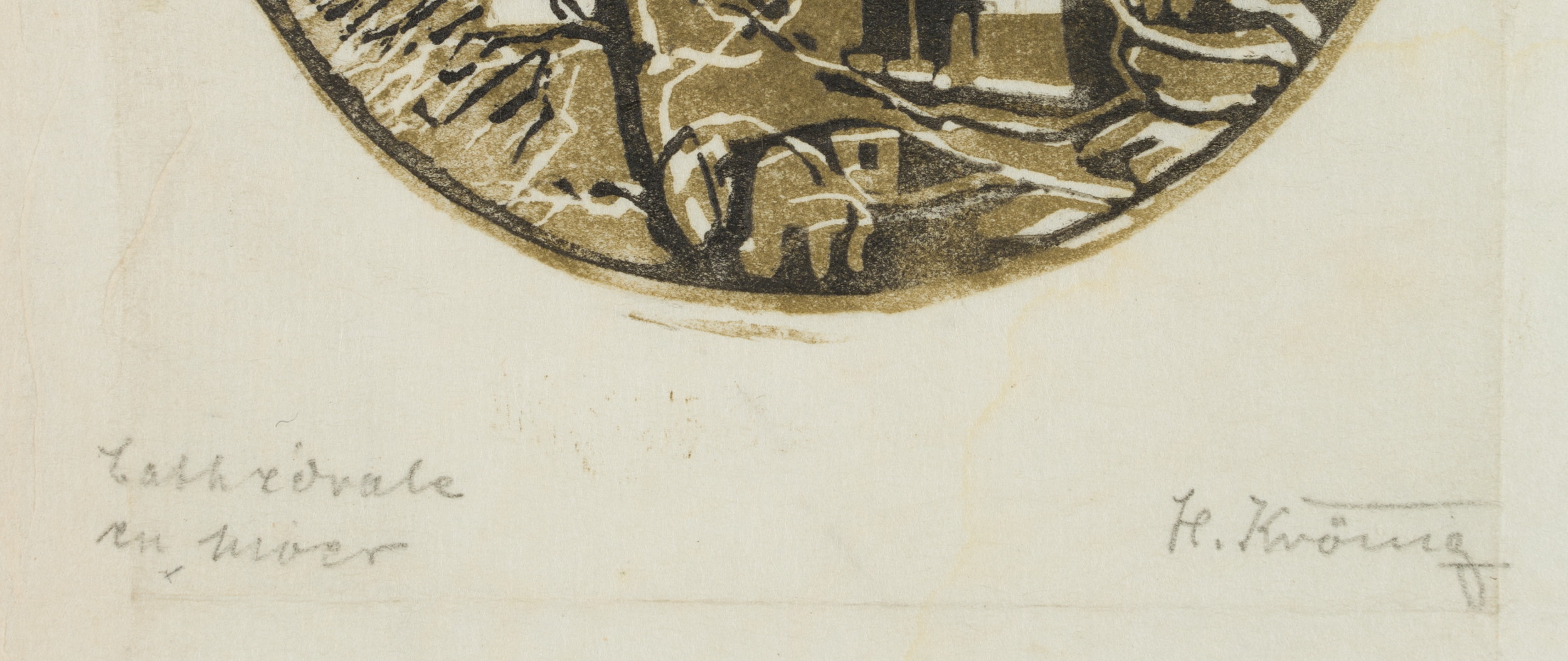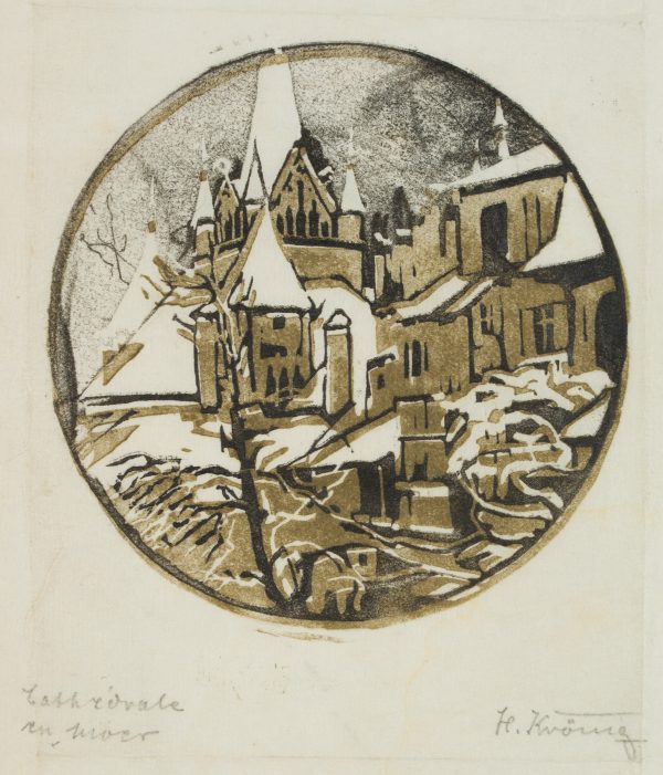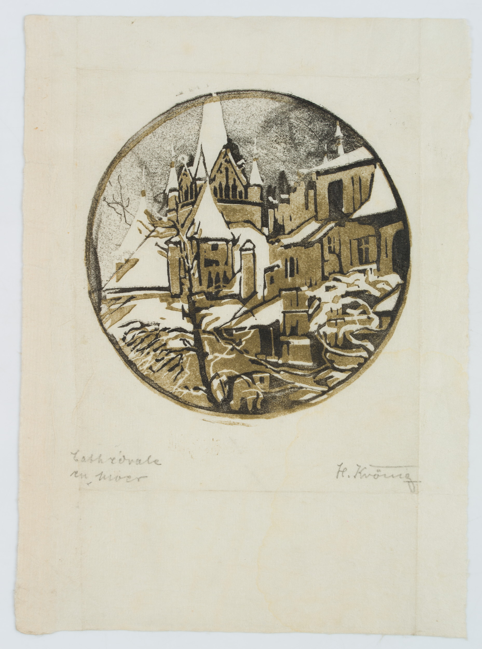 H. Krönig (20th century), Cathedral in the snow, , Color woodcut