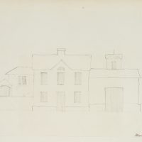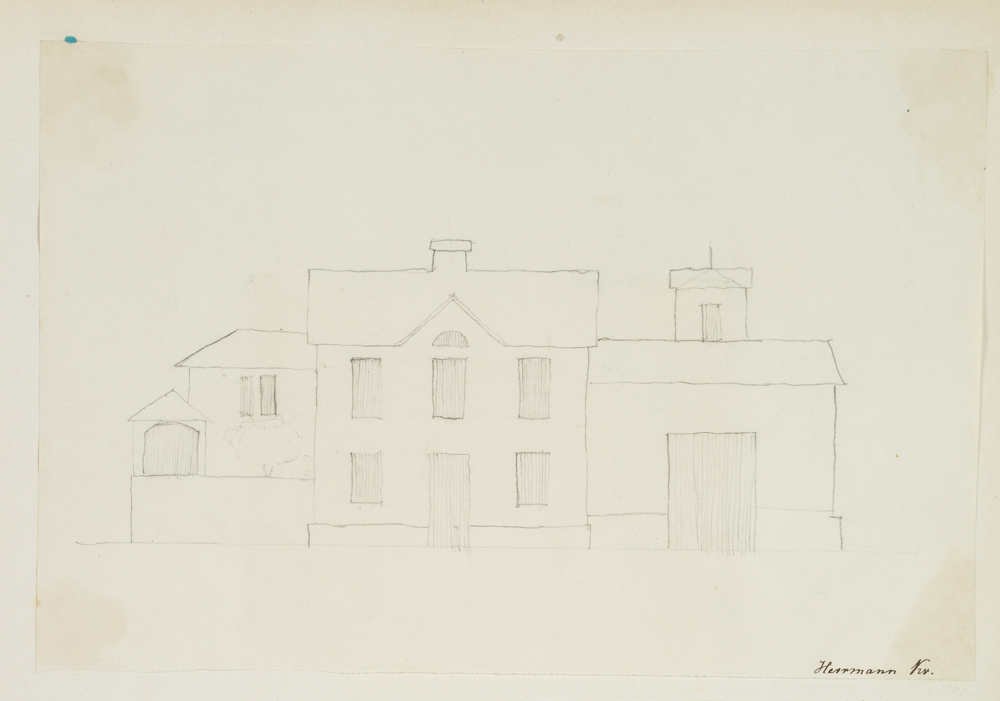 - Description: This sketch of the famous German orthopedist and doctor shows a simple side view of a house, possibly his own, that he had built after obtaining the title of chief physician of the clinic in Liegnitz. Signed at the bottom right: “ Herrmann Kr. “ It is still on a sheet of paper.