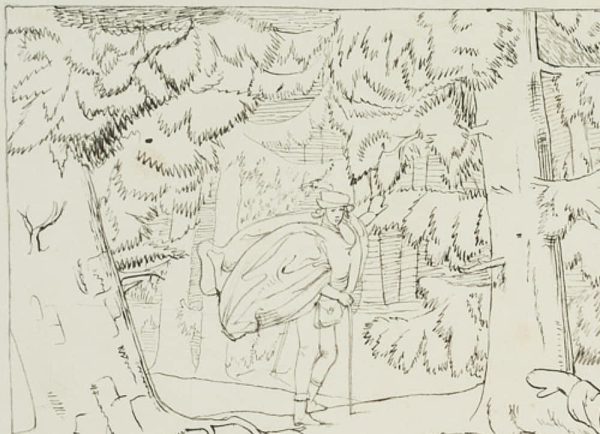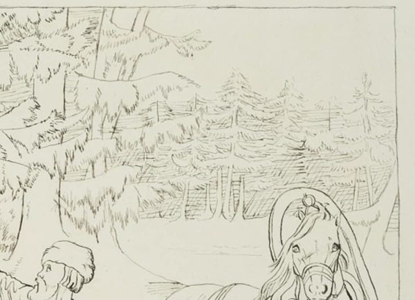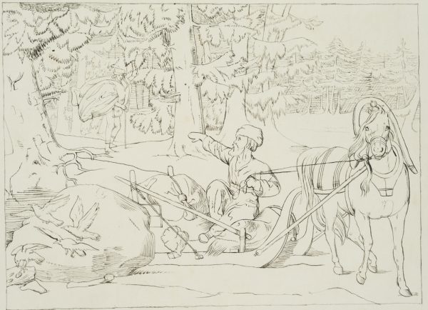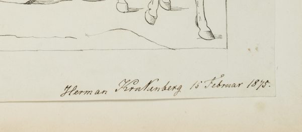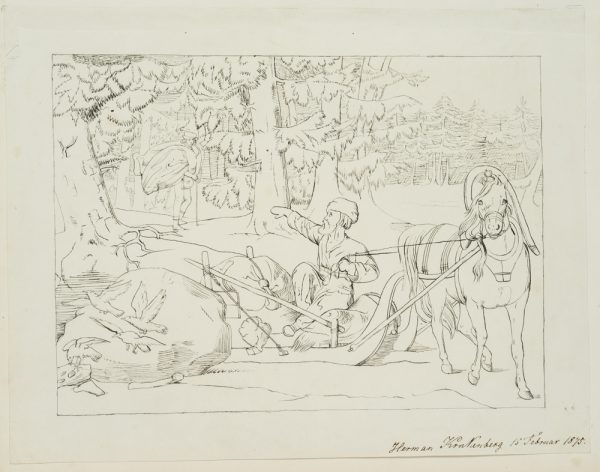 - Description: This pretty pen and ink drawing shows with a few strokes a scene in a winter landscape, reminiscent of the Russian fairy tales about Father Frost. A nobly dressed hiker in the forest meets an older man in a horse-drawn sleigh. Both point to each other with gloved hands in the picture diagonal. Signed and dated lower right: “Herman Krukenberg 15 February 1875”. The drawing is attached to another sheet.
