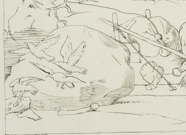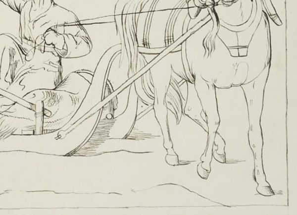 - Zustand: Die Zeichnung befindet sich in einem guten Zustand. In der oberen linken Ecke befindet sich ein kleiner Riss. Die Ränder, besonders des Papierbogens, sind zum Teil Braun verfärbt.