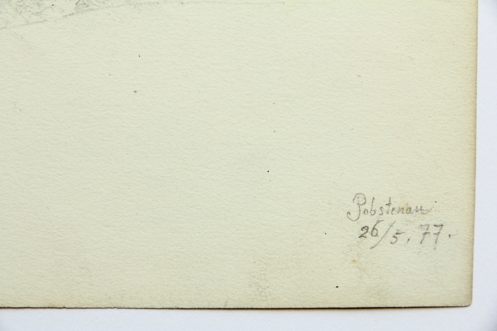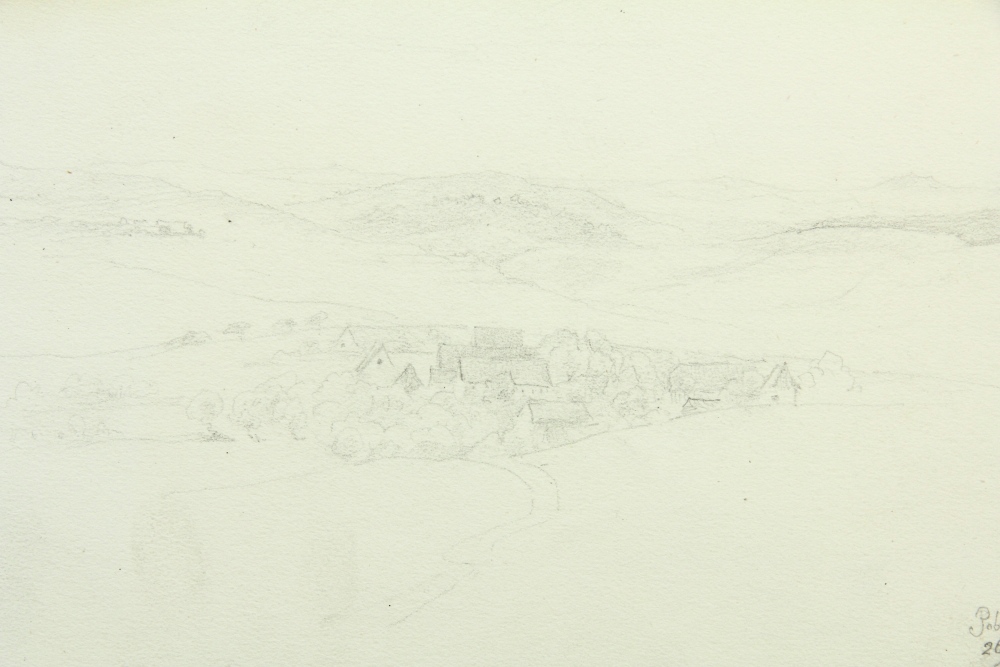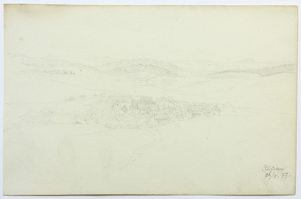 Hermann Julius Lichtenberger (unb. -1897 ebd.), Hügellanschaft mit Dorf “Pobstenau”, 1877, Bleistift