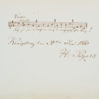 - Beschreibung: Eintrag in einem Freundschaftsalbum eines Freundes in Königsberg mit Noten und Text zu dem Kanon “Froh zu sein bedarf es wenig” und kleiner Zeichnung eine Kreuzes mit Herz links oben. Eigenhändige Eintragung von Hermann Pätzold, Komponist und Dirigent an der Musikalischen Akademie in Königsberg.