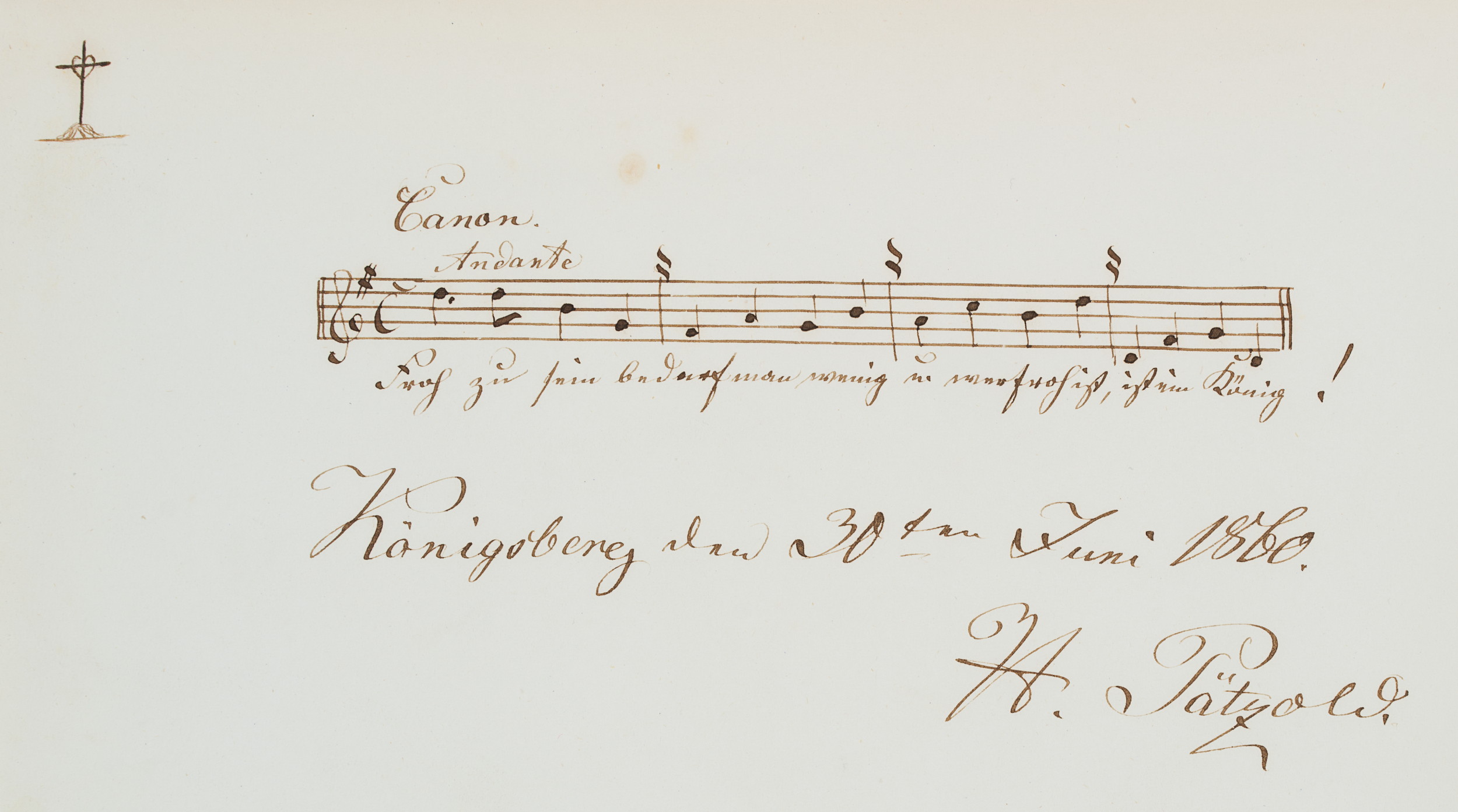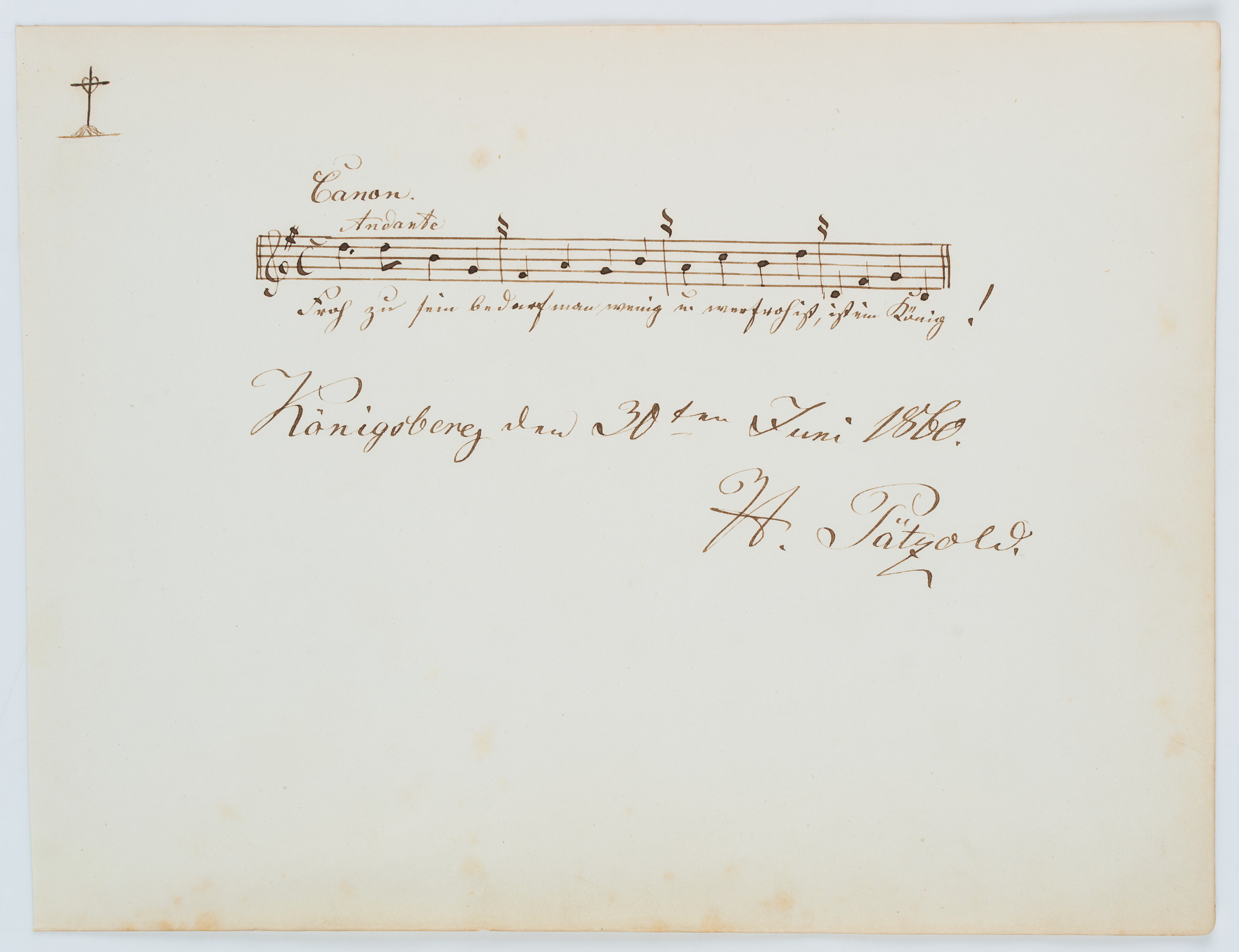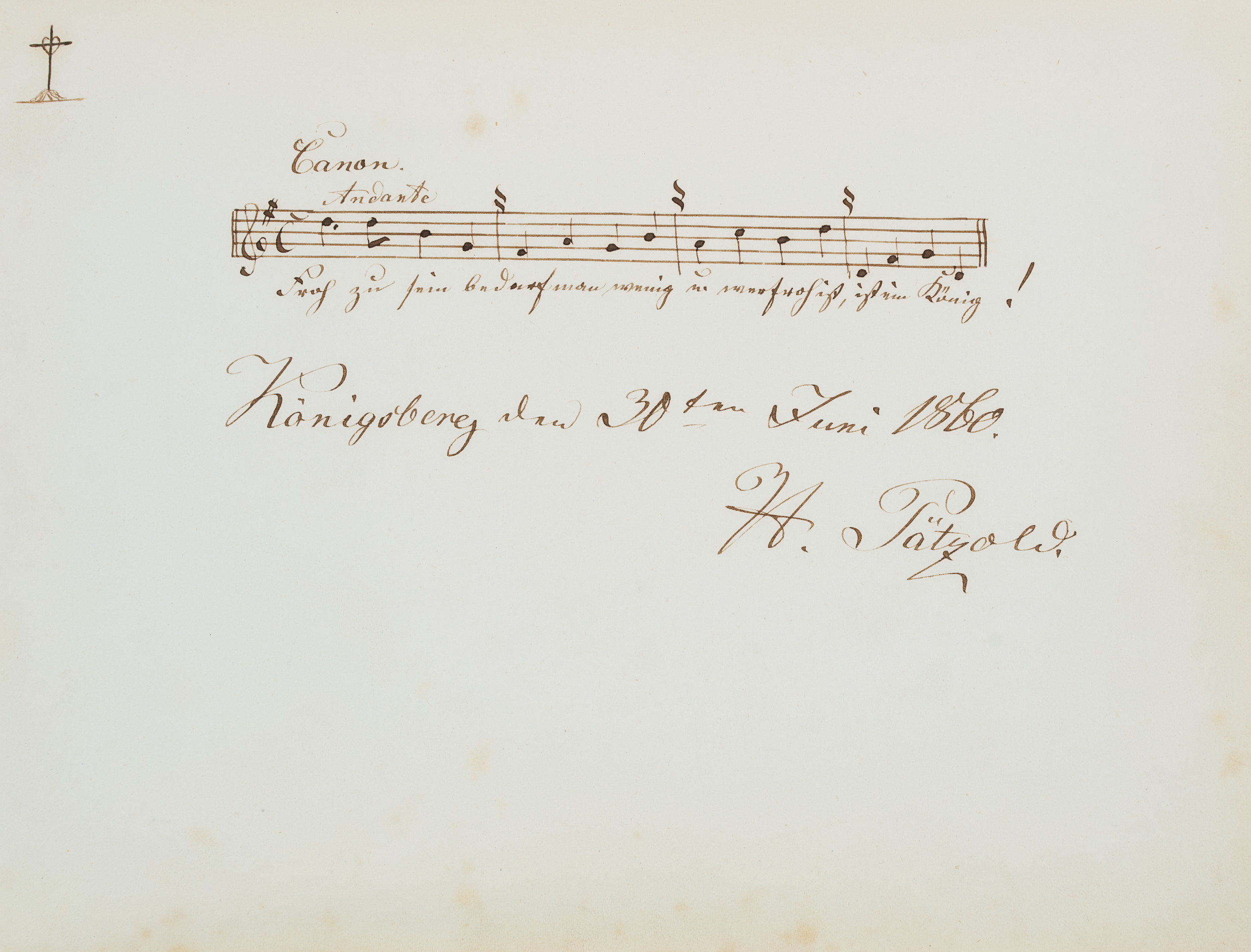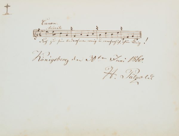 - Description: Entry in a friendship album of a friend in Königsberg with notes and text to the canon “Froh zu sein bedarf es wenig” and a small drawing of a cross with a heart in the upper left corner. Handwritten entry by Hermann Pätzold, composer and conductor at the Musical Academy in Königsberg.