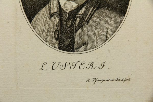 - Description: Heinrich PFENNINGER (1749 Zurich – 1815 Dresden), Portrait of Leonhard Usteri (1799 Zurich – 1833 Bern), Reformed theologian, stipple engraving. Description: Stipple engraving on paper. Signed in the stone below the image and with the sitter’s name. On the reverse a collection stamp with the monogram “EK”.