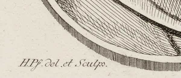 - Description: Portrait of a bust in profile in an oval. Inscribed above in the printing plate with an initial of the sitter: “H.”.