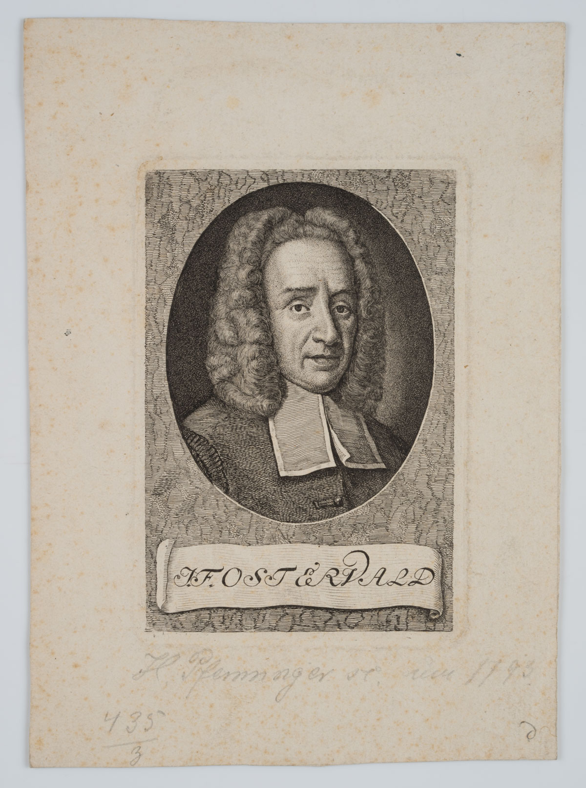 - Bezeichnung: Unterhalb mit dem Namen des Dargestellten bezeichnet: “J. F. Ostervald”. Darunter in Bleistift von fremder Hand bezeichnet mit: “H. Pfenninger sc, um 1793”.