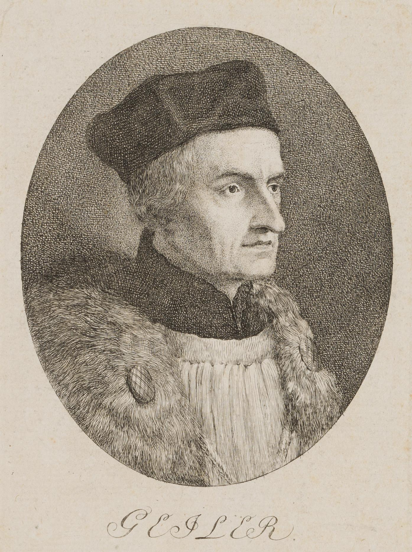 - Beschreibung: Zum Werdegang: 1460 Studium in Freiburg an der Artistenfakultät, 1478 beginnt Geiler eine Predigerstelle im Straßburger Münster. 1501 wird er zum kaiserlichen Kanzler ernannt.