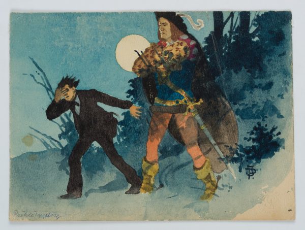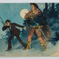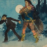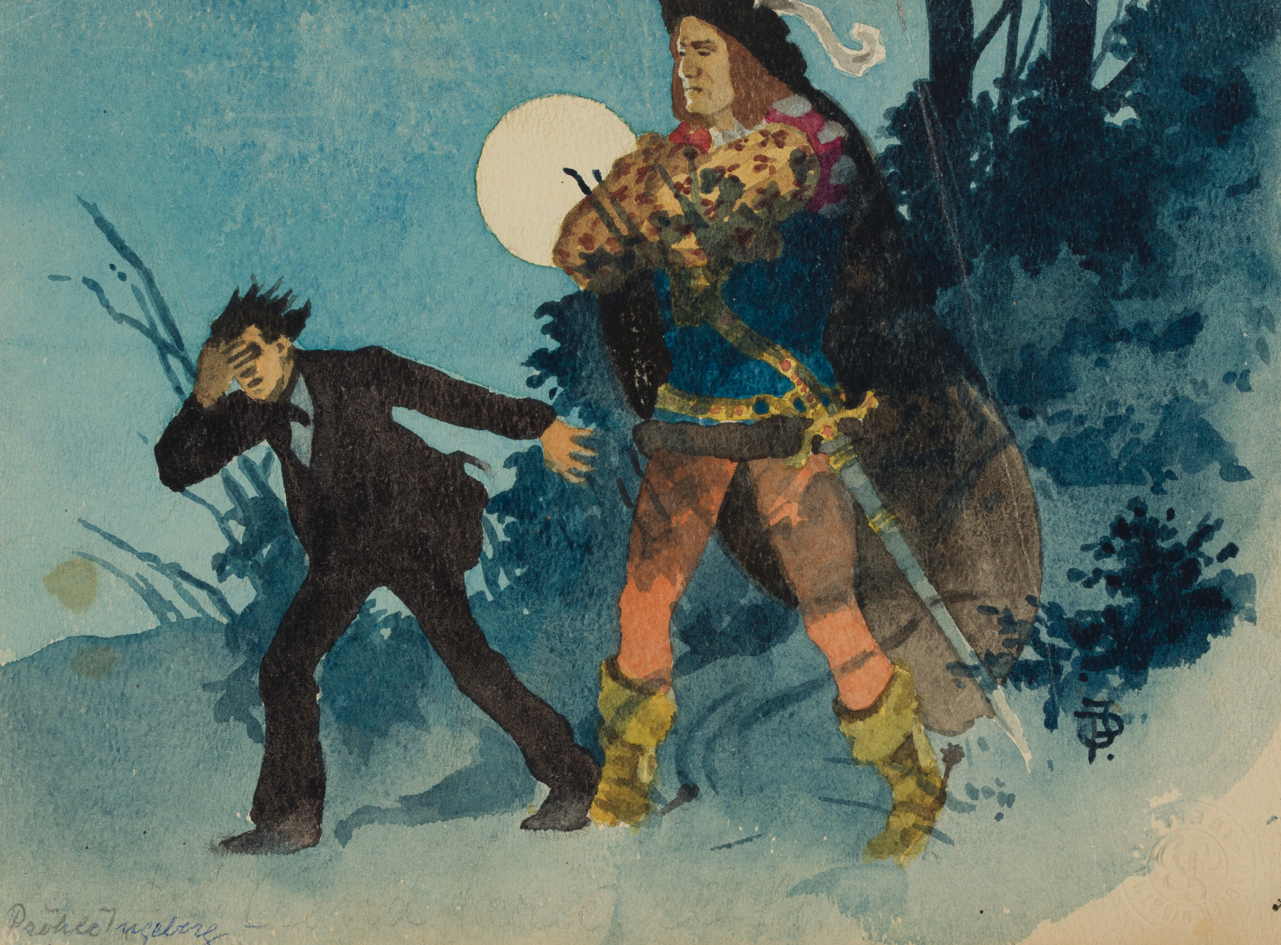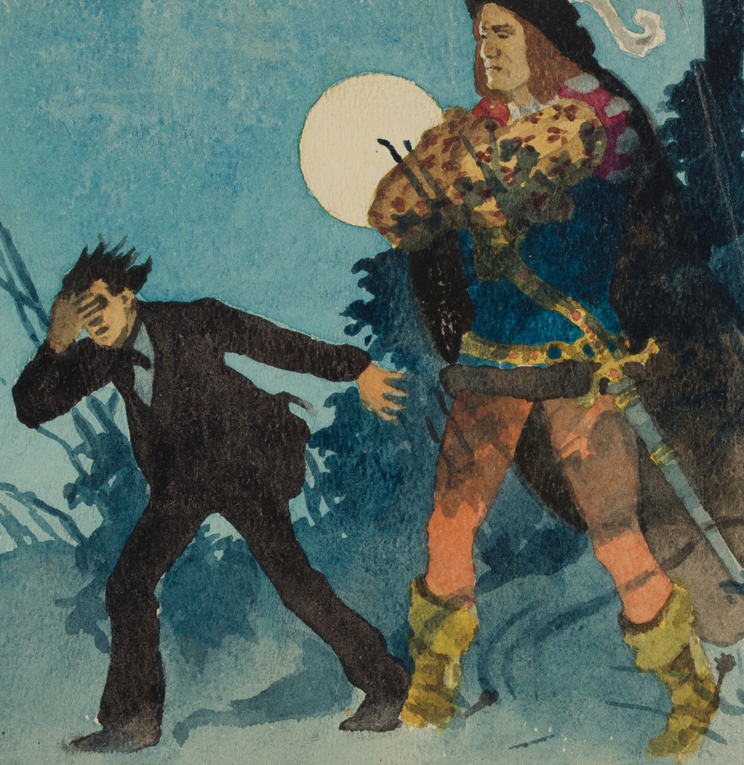 - Description: At night under the full moon, a young man in evening dress is driven out of a wooded area by a tall noble warrior with a sword and a feathered hat.