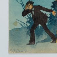 Heinrich Pröhle (1822 Satuelle – 1895 Steglitz), Surreal fairytale scene with noble warrior who drives the young man in the dinner jacket out of the forest, c. 1885, Watercolor