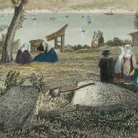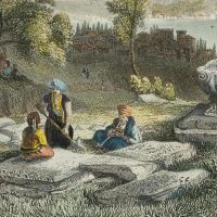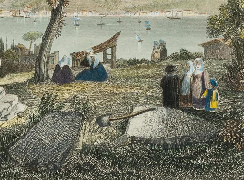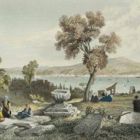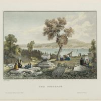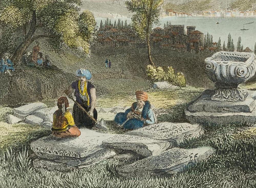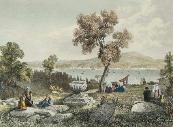 Hans Christian Reiss (18th century) attributed, View of the Bosphorus with groups of figures in Muslim dress resting on the shore, 19th century, Steel engraving