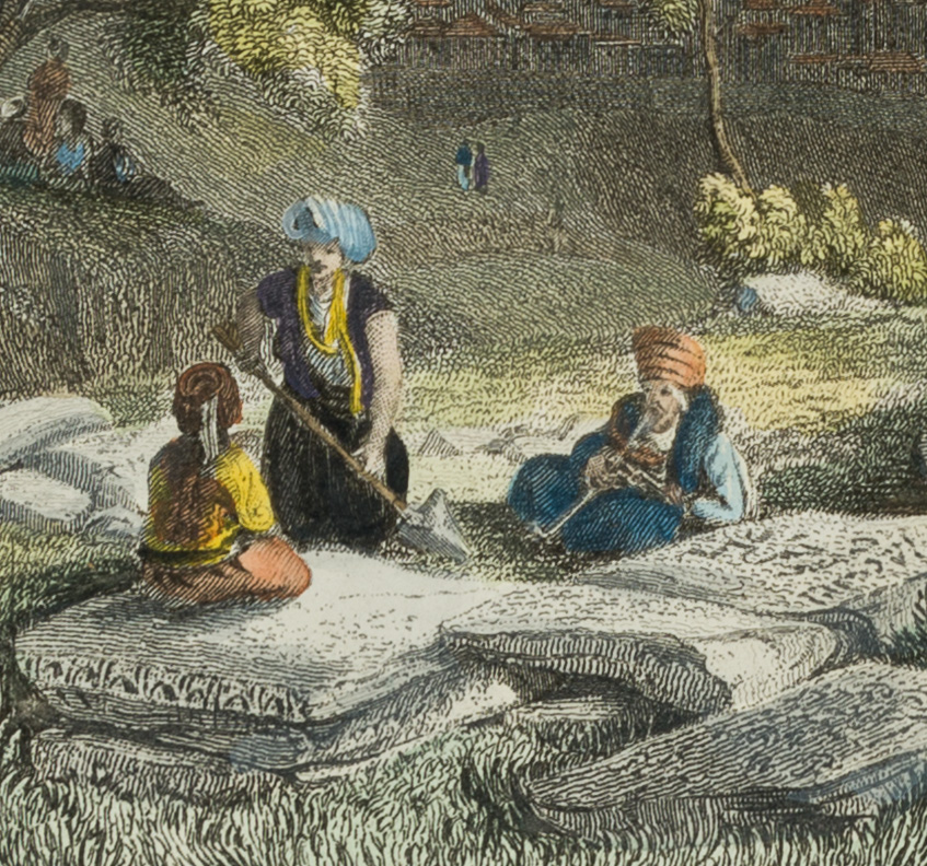 Hans Christian Reiss (18. Jahrhundert) zugeschrieben, Blick auf den Bosporus mit rastender muslimisch gekleideter Figurengruppen am Ufer, 19. Jahrhundert, Stahlstich