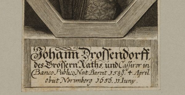 Hans Jacob Schollenberger (17. Jahrhundert) zugeschrieben, Porträt des Johann Drossendorff (1589 Bayreuth – 1656 Nürnberg), Nürnberger Ratsherr u. Bankkassierer, Brustbild im Dreiviertelporträt nach links vor dichtschraffiertem Hintergrund im achteckigen Rahmen, , Kupferstich