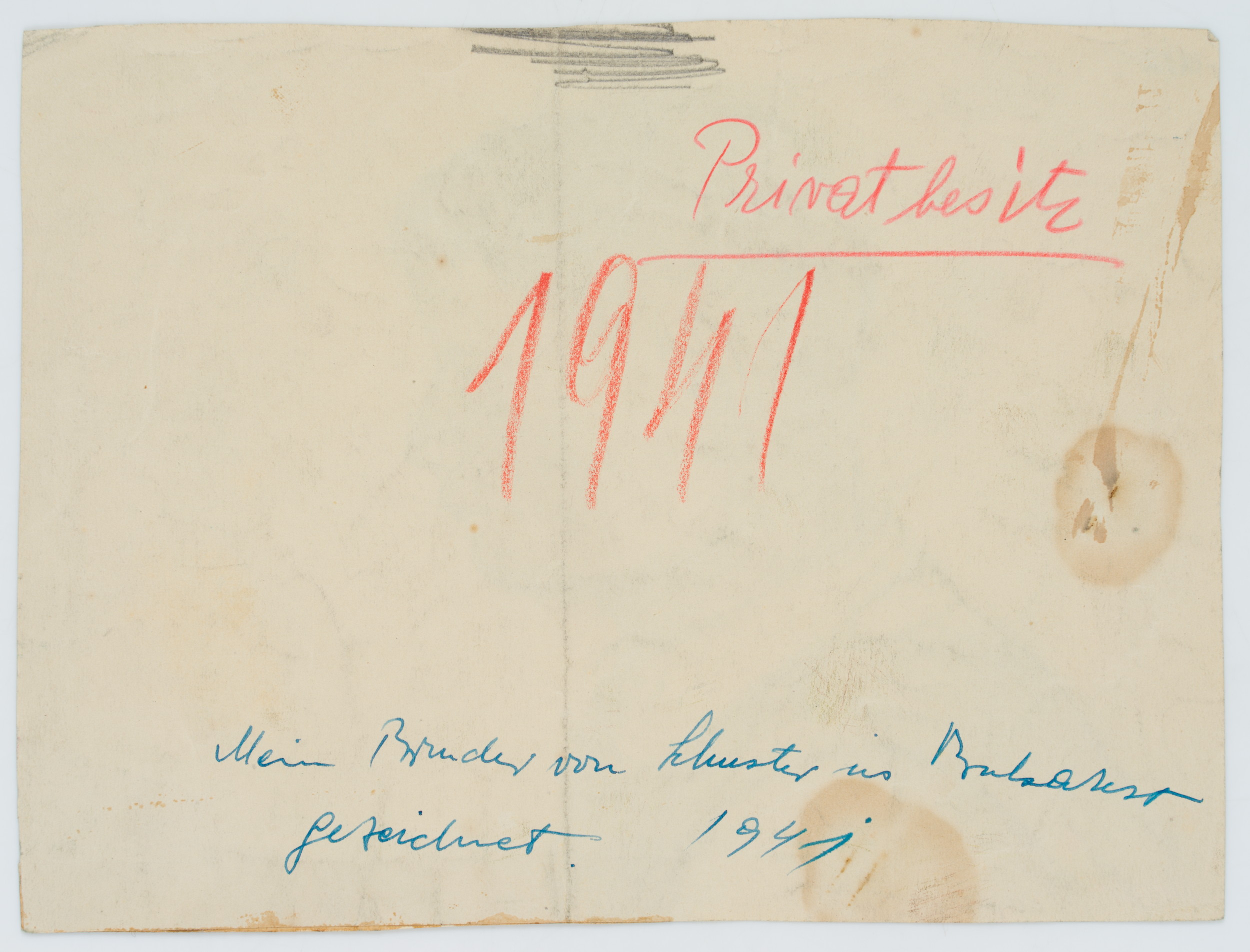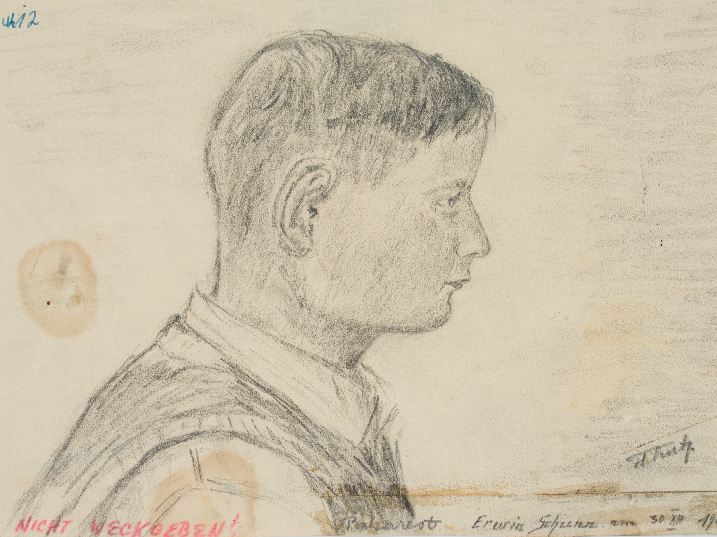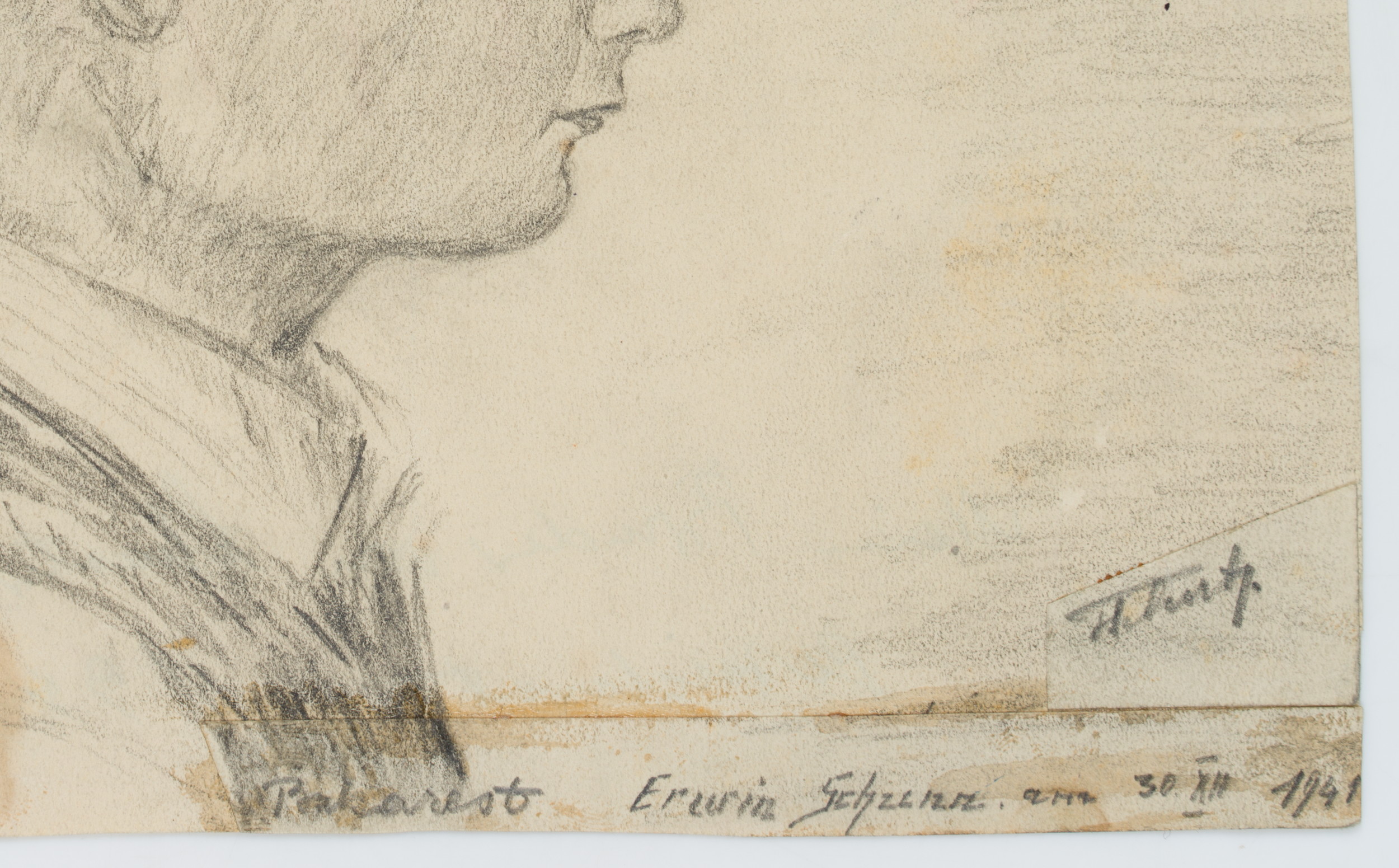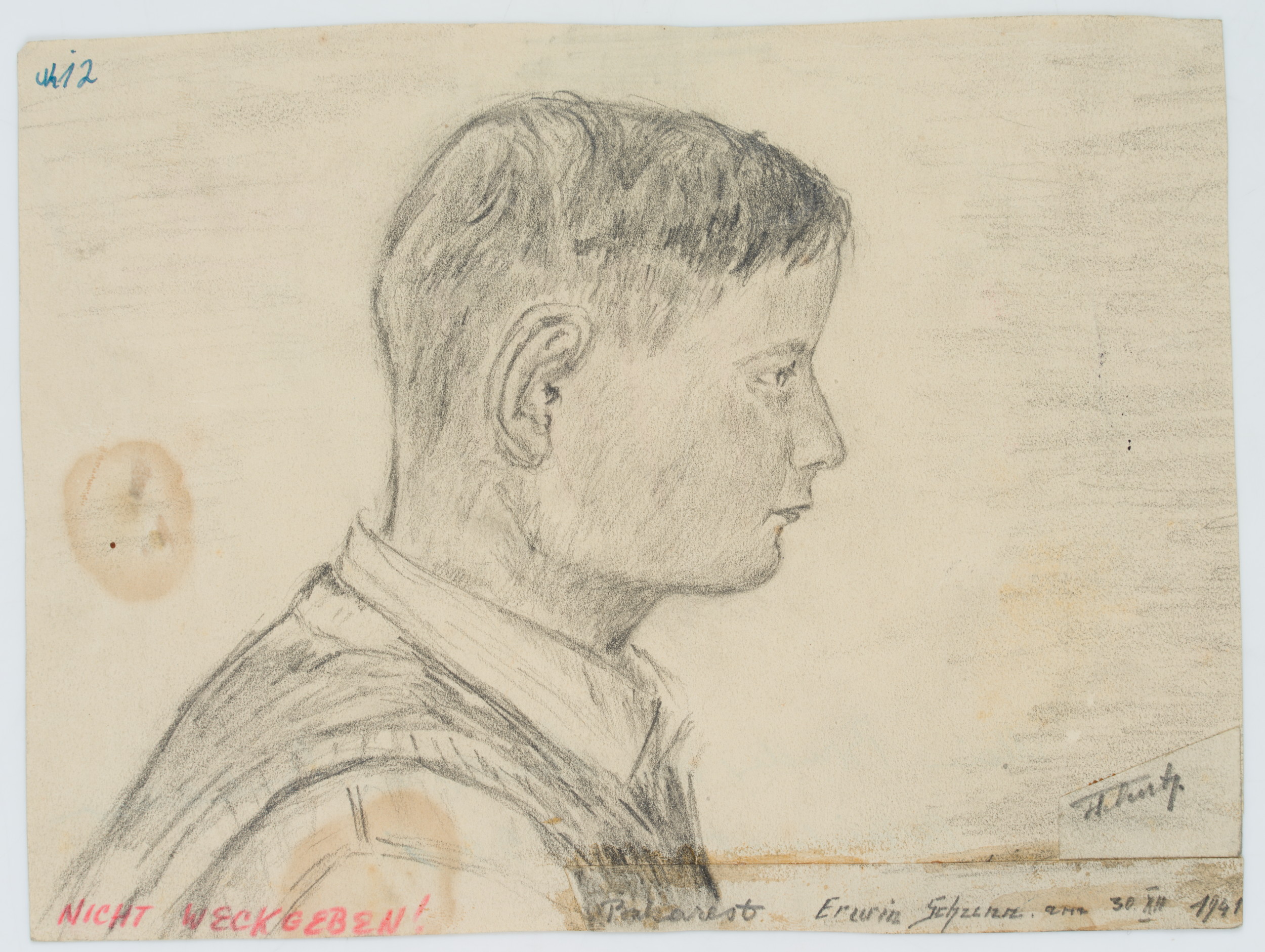 • Bezeichnung: Unten rechts datiert: “am 30. XII 1941”. Eigenhändig bezeichnet: “[?]12 / Nicht weckgeben! / Bukarest Erwin Schunn / [unkenntlich]”, verso: “Privatbesitz / 1941 / Mein Bruder von Schwester in Bukarest gezeichnet. 1941”.