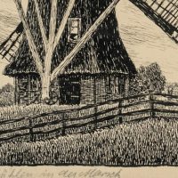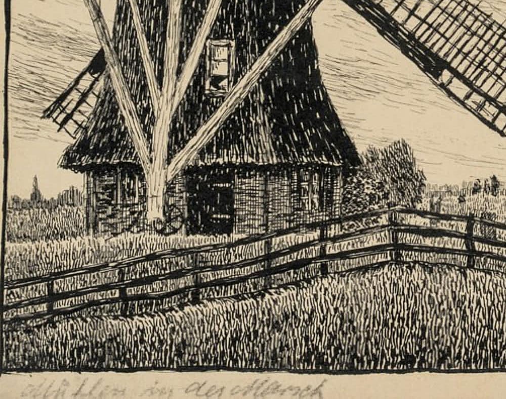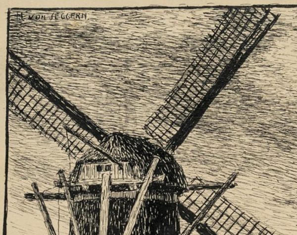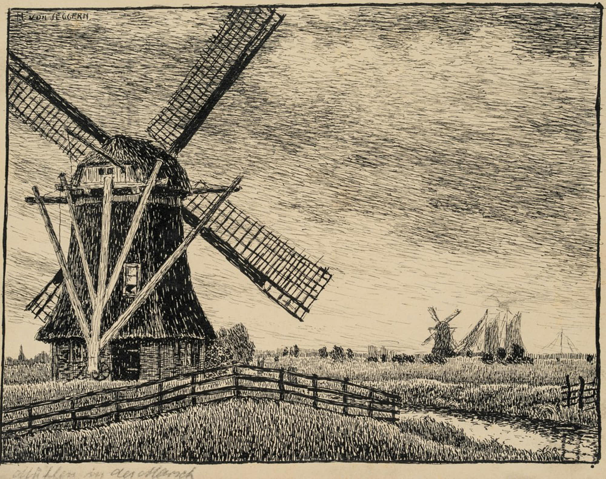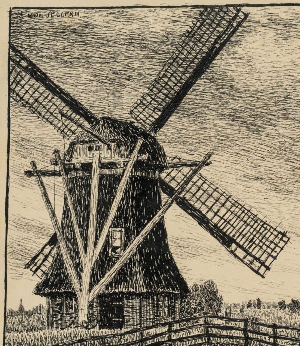 H. von Seggern (19. Jahrhundert), Mühle in der Marsch, um 1910, Federzeichnung