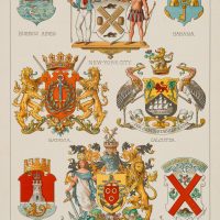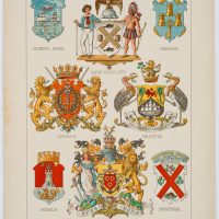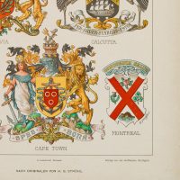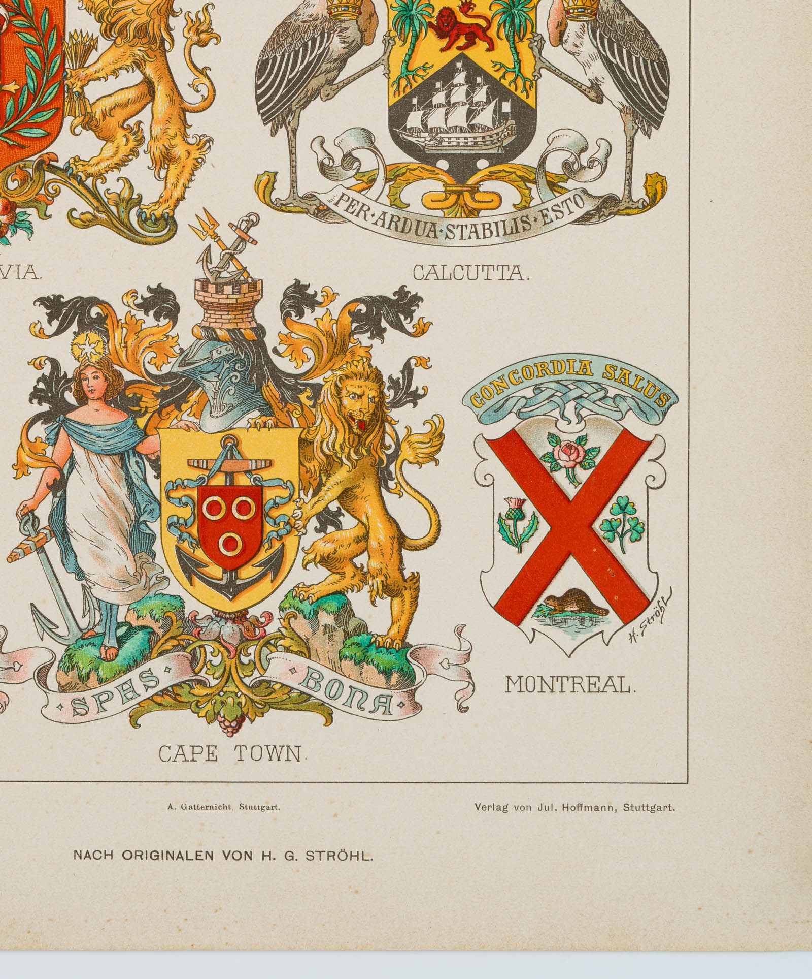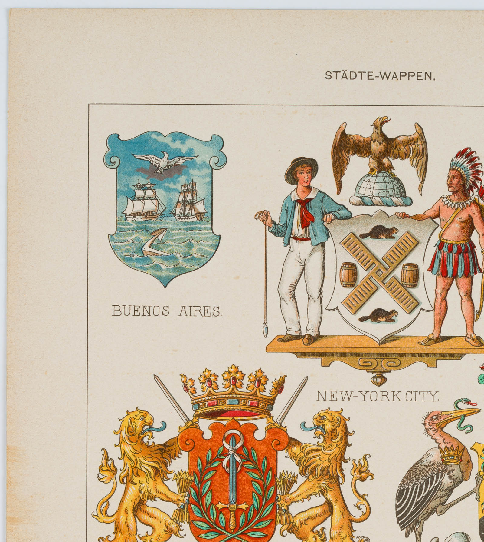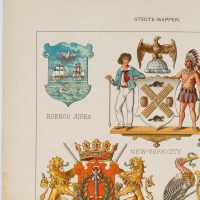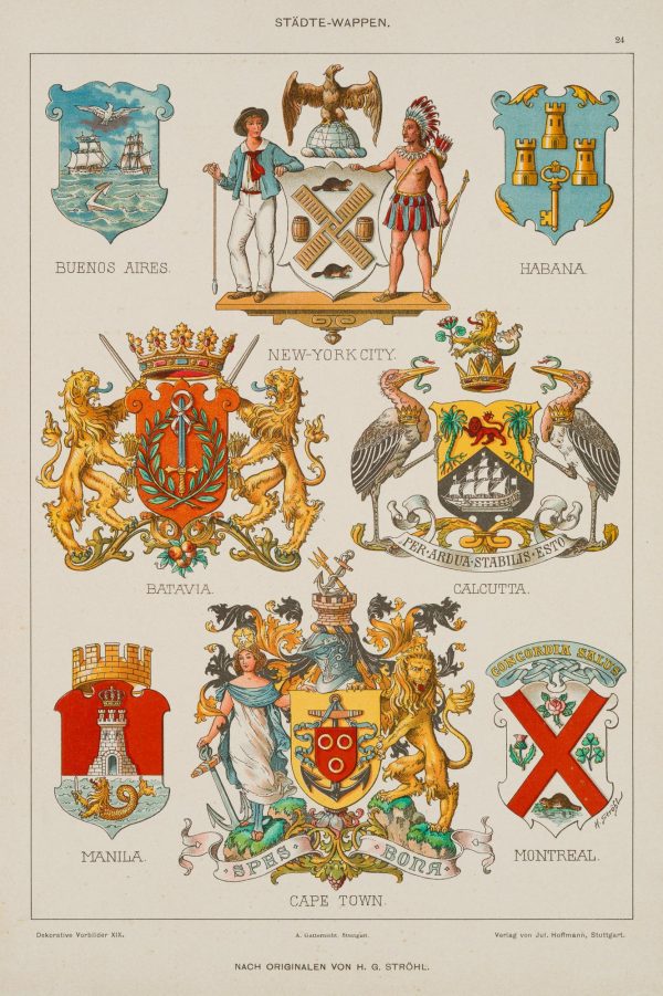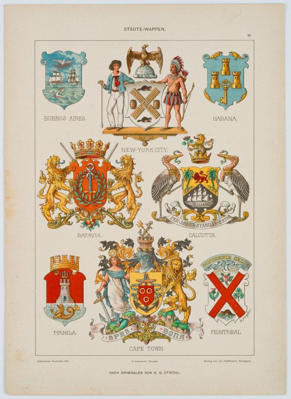 Hugo Gerard Ströhl (1851 Wels – 1919 Mödling), Städte Wappen in dekorativer Ausgestaltung, Buenos Aires, New York, Kapstadt, um 1900, Lithographie, aus: Dekorative Vorbilder XIX., Verlag Julius Hoffmann, Stuttgart, um 1900, Farblithographie