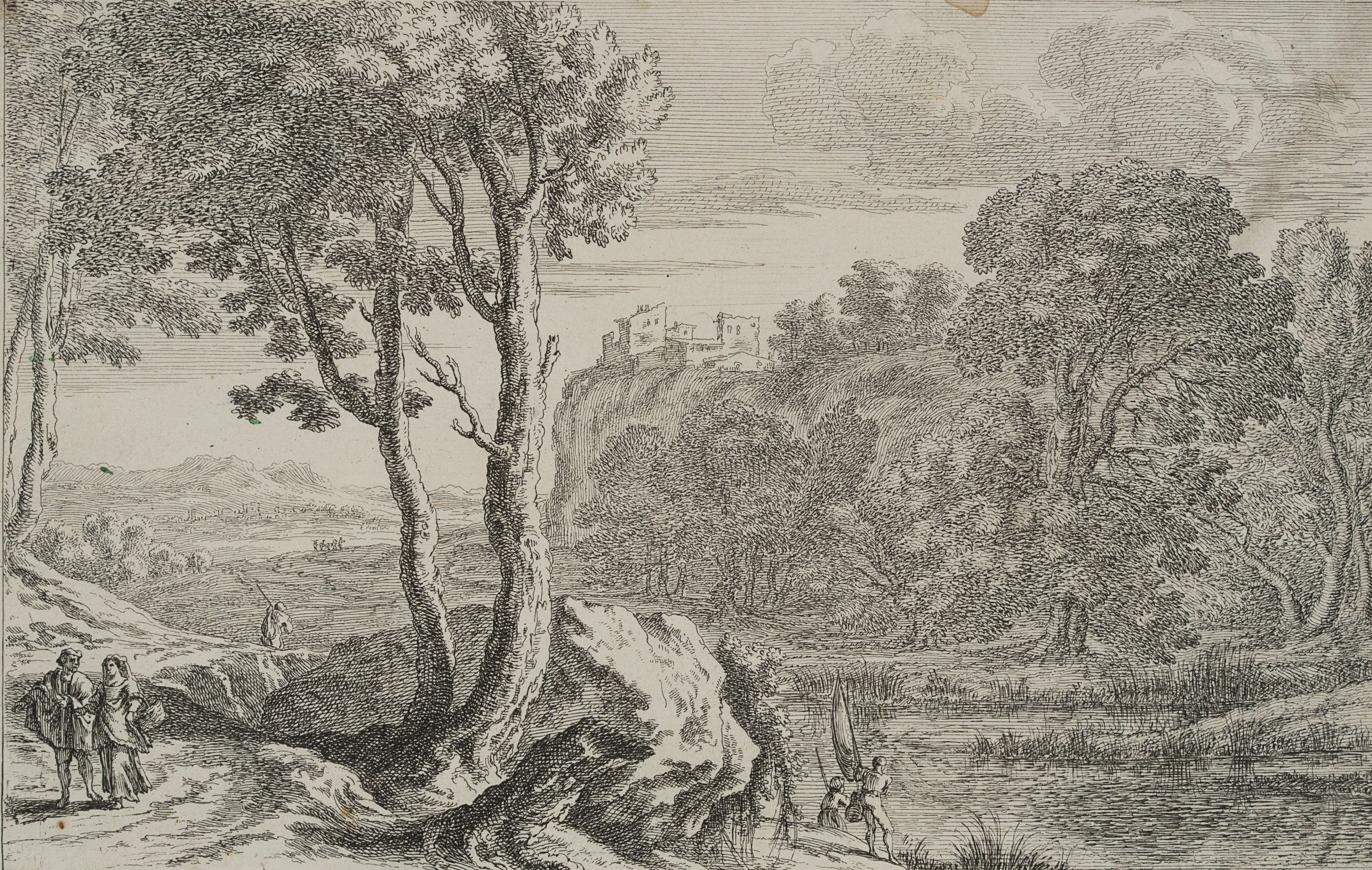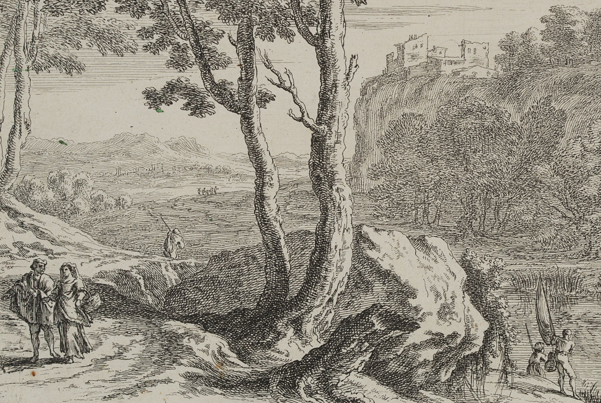 Herman van Swanevelt (um 1600 Woerden – 1655 Paris), Die Angler. Flusslauf durch felsige Landschaft, um 1650, Radierung
