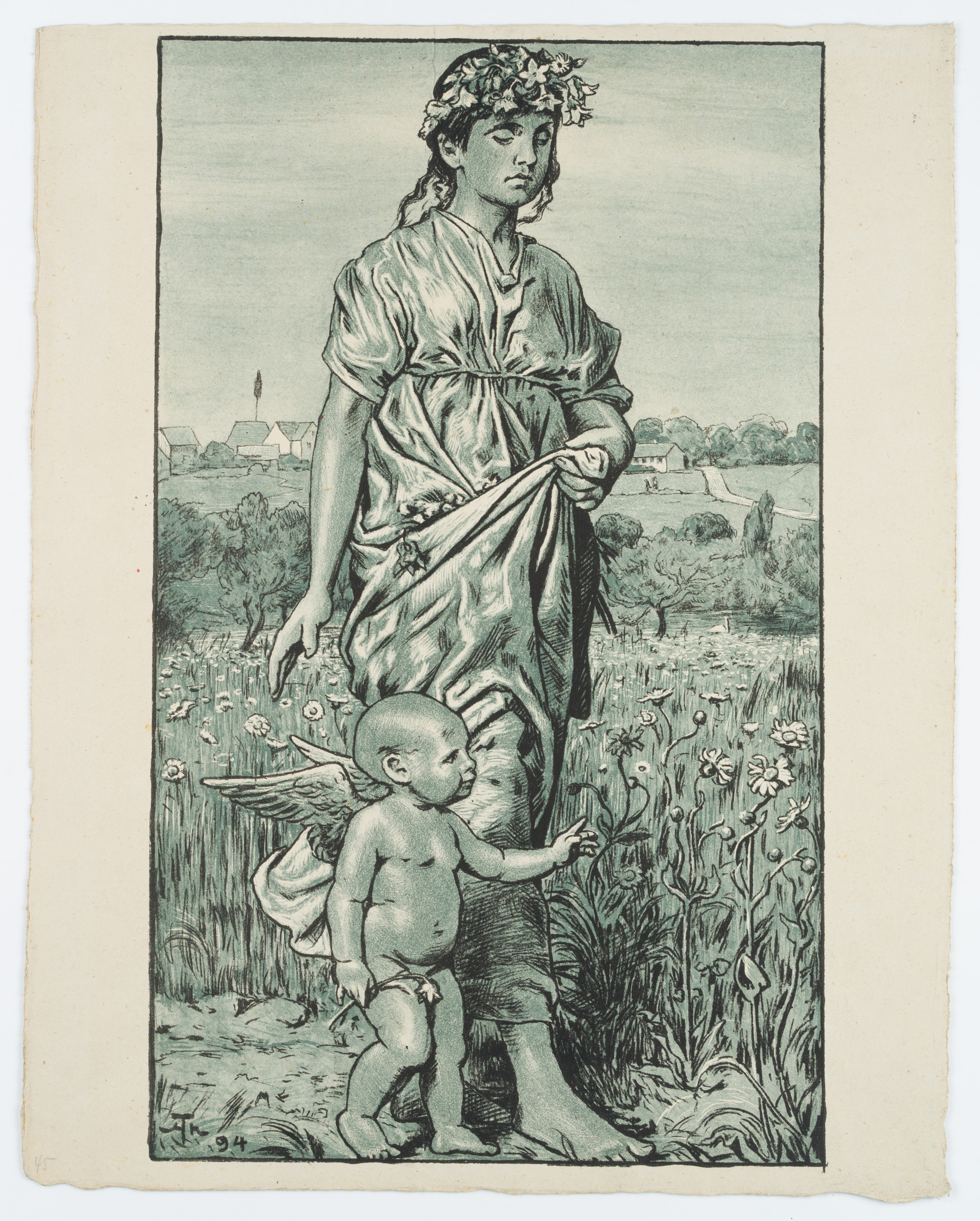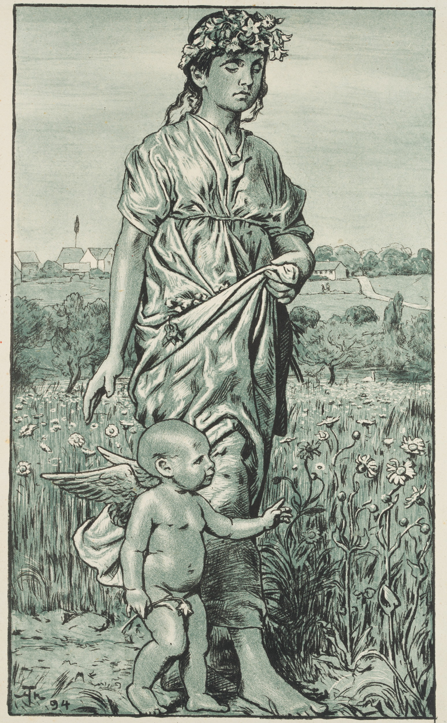 - Description: Full-length depiction of a girl in antique costume in a flower meadow. She wears blossoms in her apron and flowers are braided in her hair. Cupid is walking next to her.