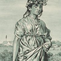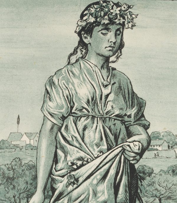 - Beschreibung: Ganzfigurige Darstellung eiens Mädchens in antiker Tracht in einer Blumenwiese. In der Schürze trägt sie Blüten und im Haar sind Blumen eingeflochten. Neben ihr geht Amor.