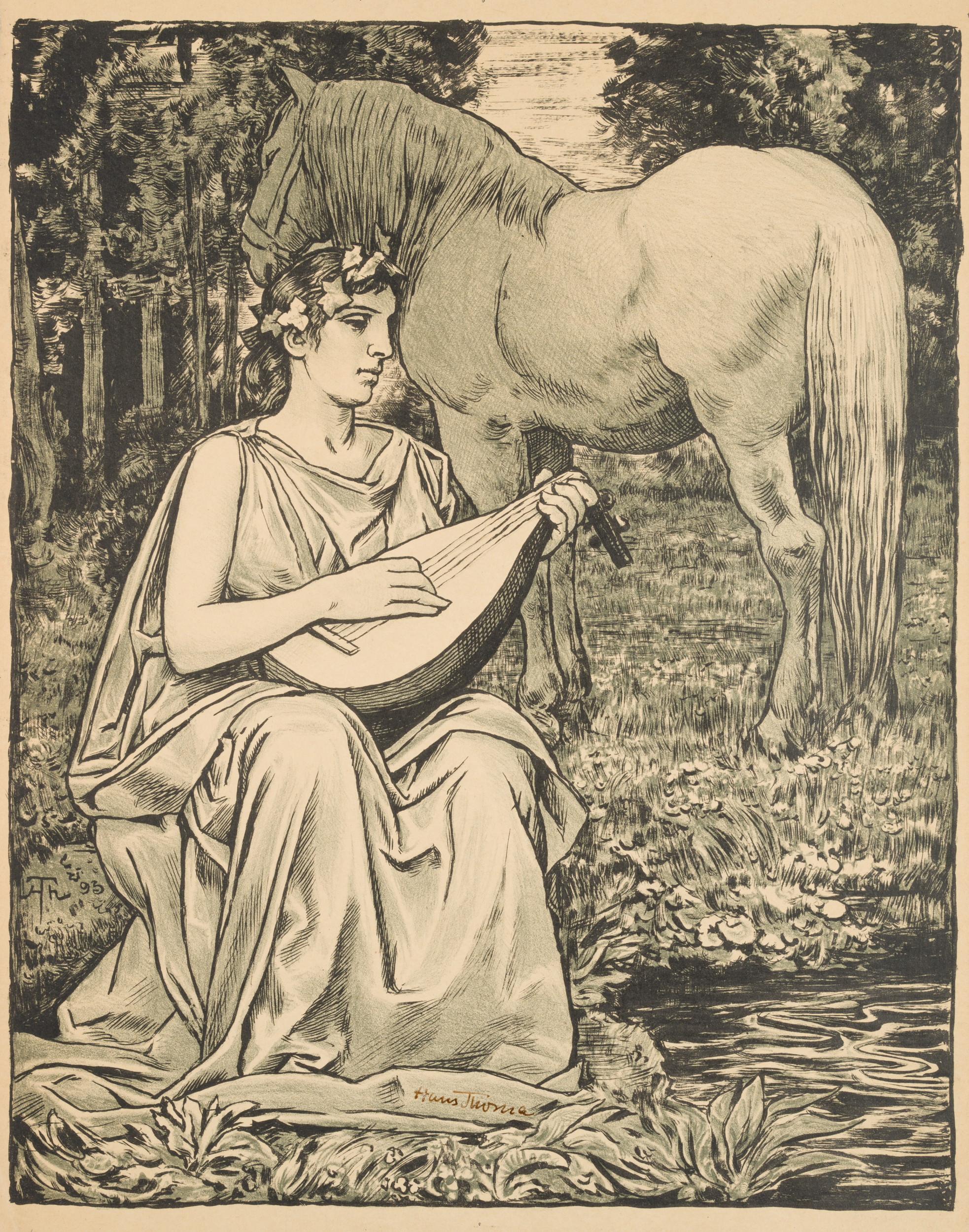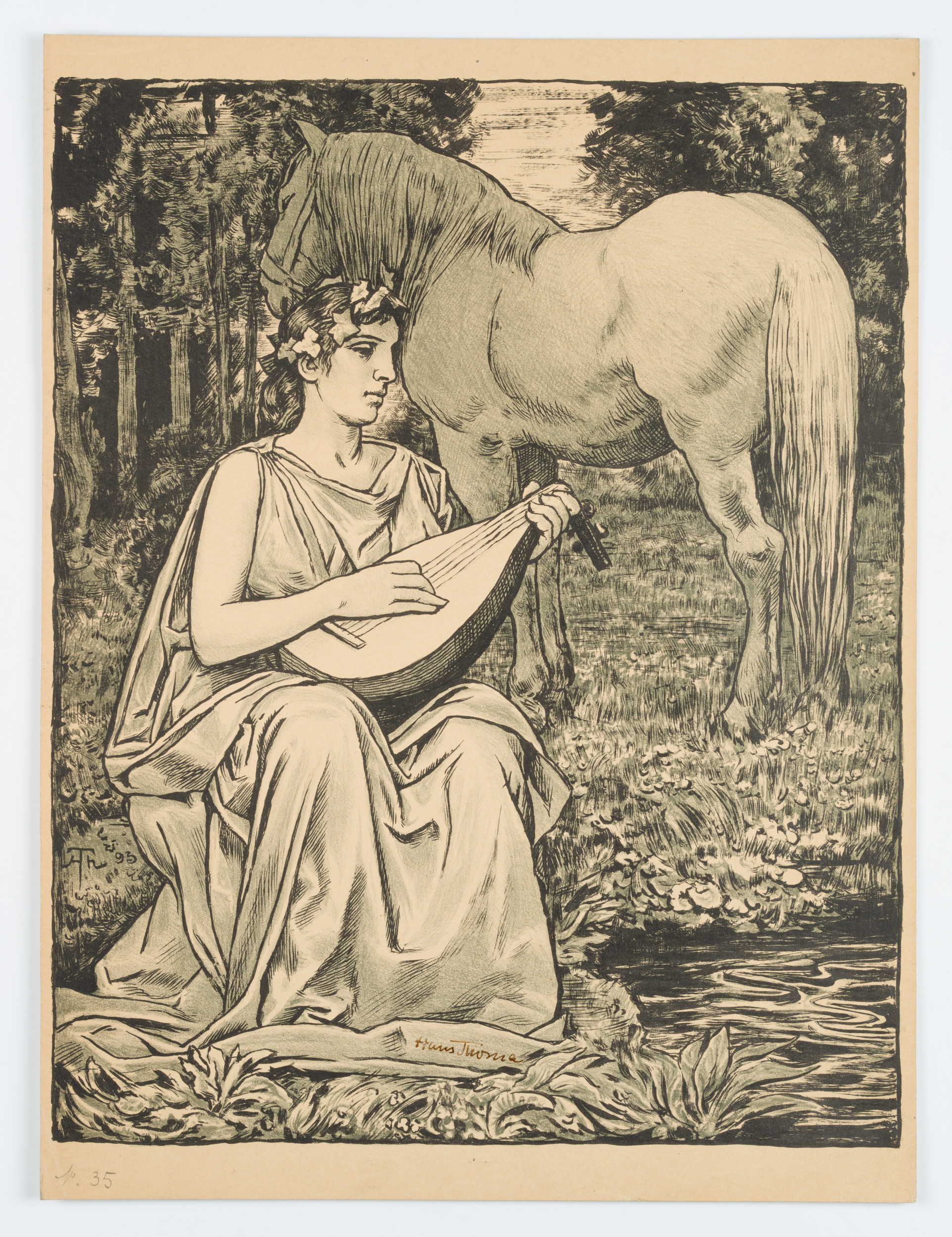 Hans Thoma (1839 Bernau – 1924 Karlsruhe), Frau mit Laute und Pferd, Muse am Teich, 1893, Lithographie