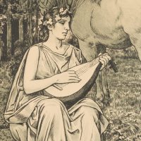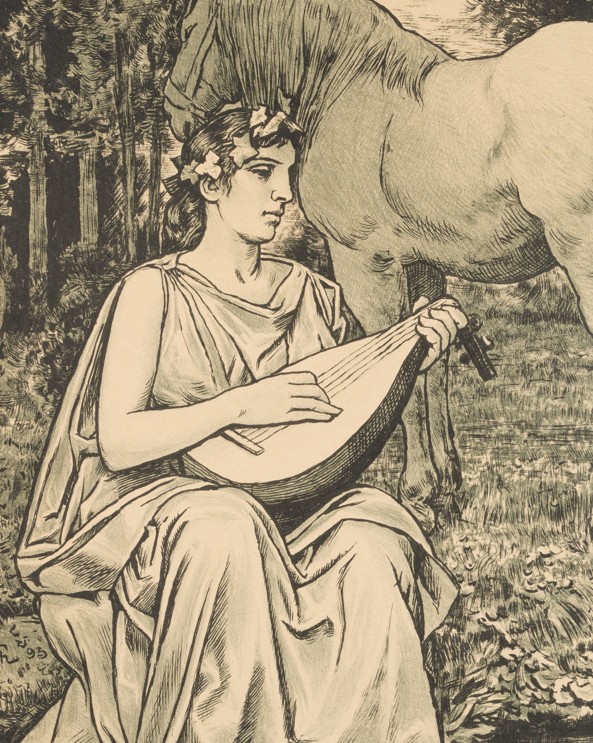 - Description: Muse in antique costume playing the lute sitting by a forest pond. A horse stands in the background.