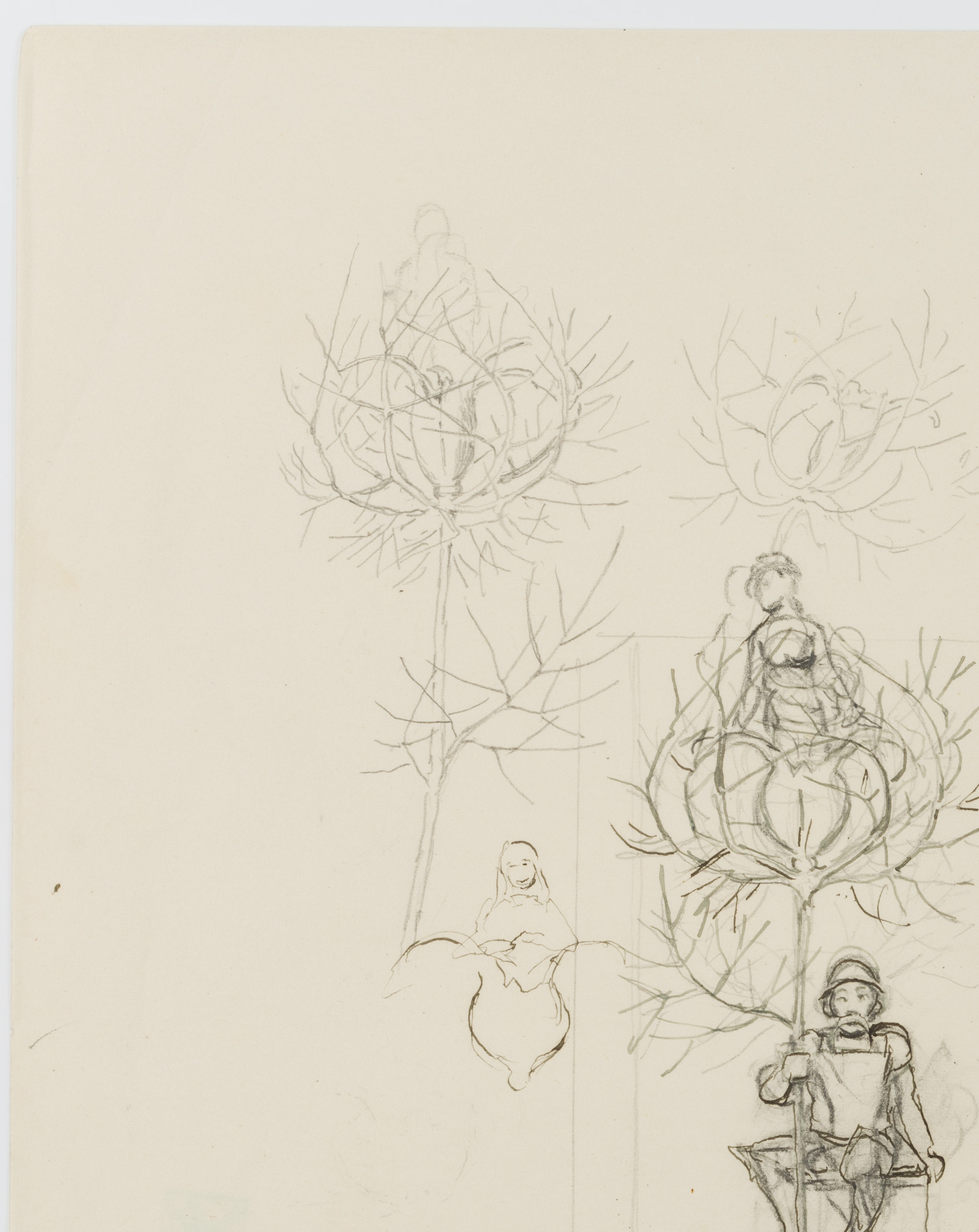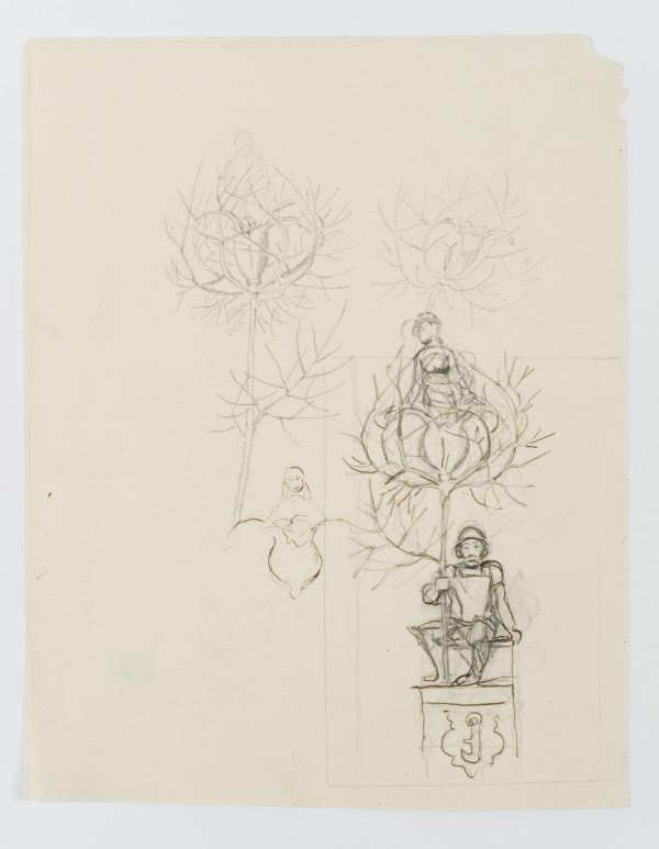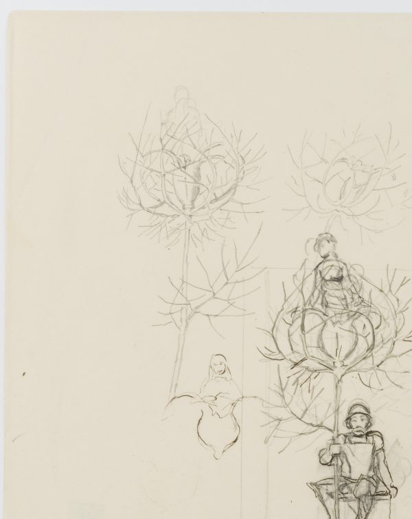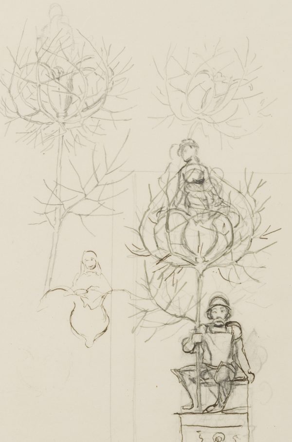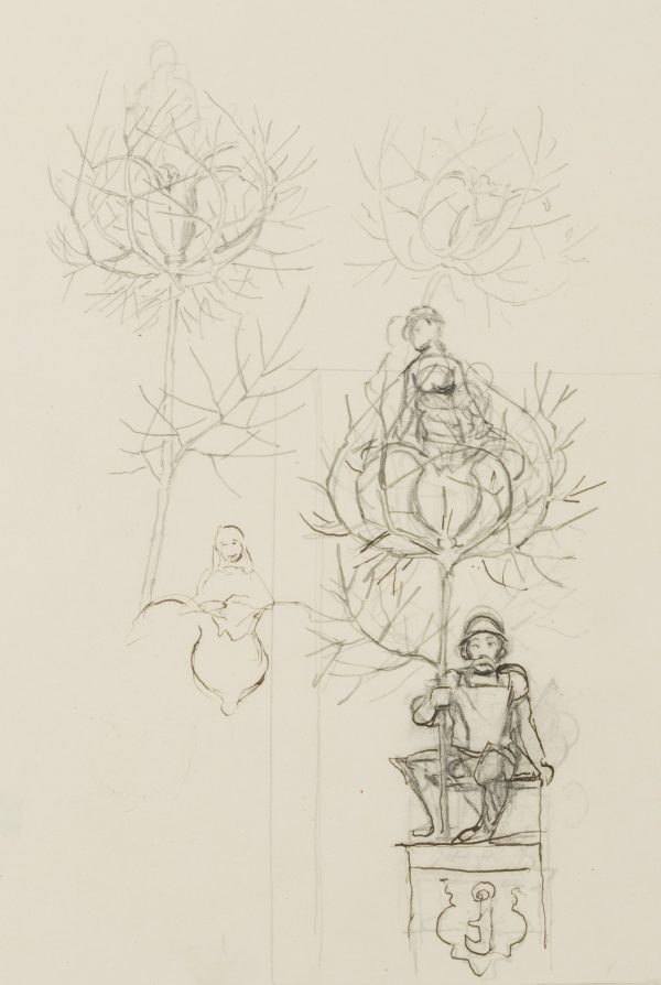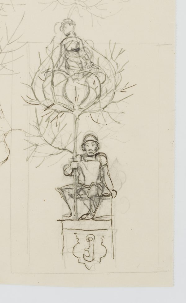 - Description: The drawing served as a sketch for the etching “Gretel im Grünen” from 1915 (cf. Verz. d. Radierungen No. 165). A knight in his armour with helmet and lance is sitting on a pedestal. From the tip of the lance emerges a flower surrounded by thorny, sheetless branches, in which again a female figure is enthroned. To the left and above are two further sketches of the female figure and the blossom in the thorny cage. This and other works in the exhibition come from a portfolio of sketches from the personal estate of Hans Thoma.