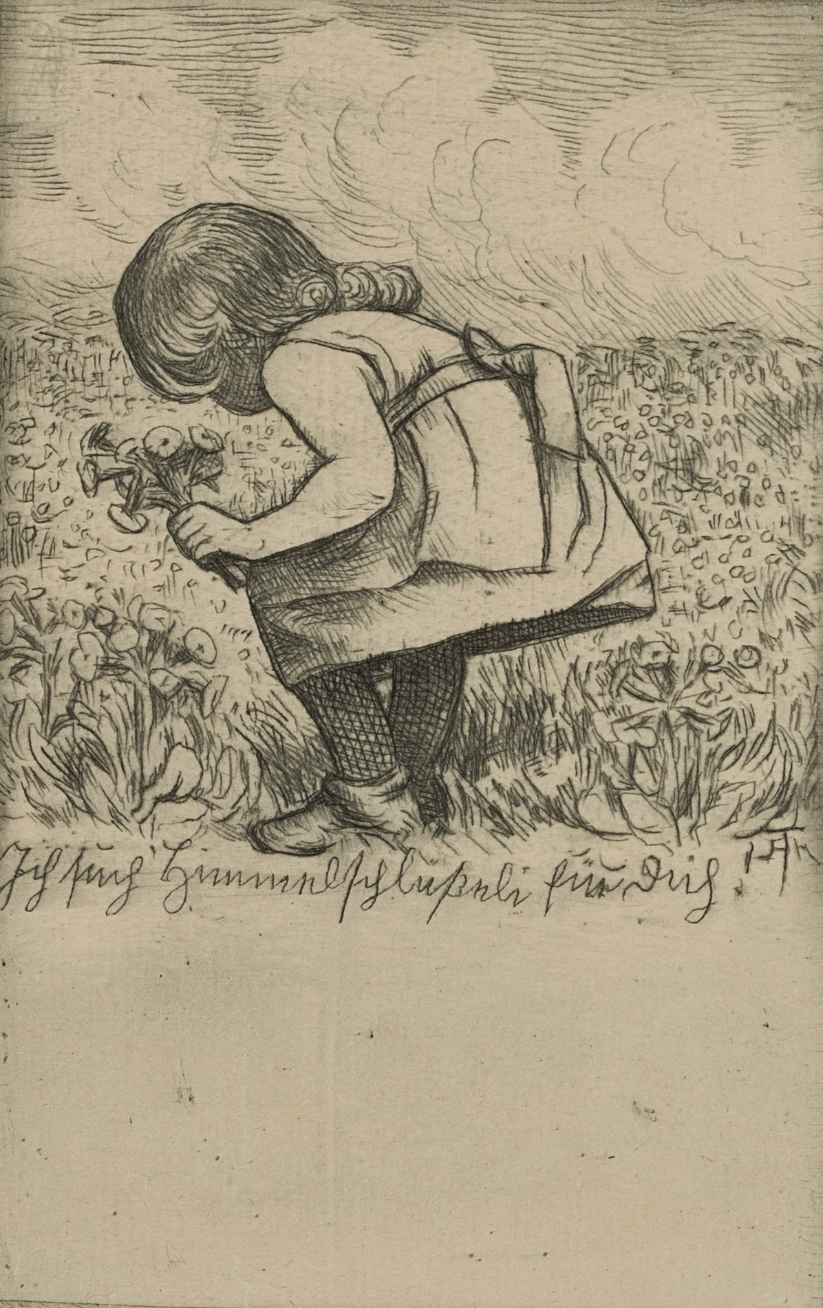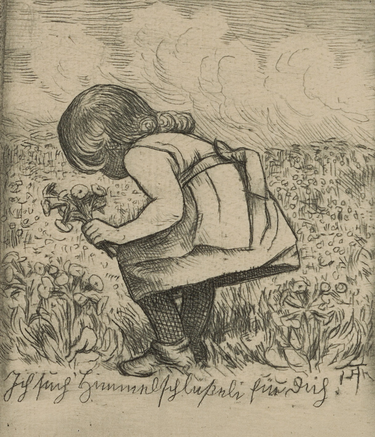 Hans Thoma (1839 Bernau – 1924 Karlsruhe), Himmelsschlüsselchen. Ich suche Himmelsschlüßeli für dich, 1913, Radierung