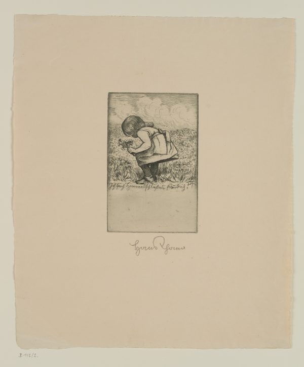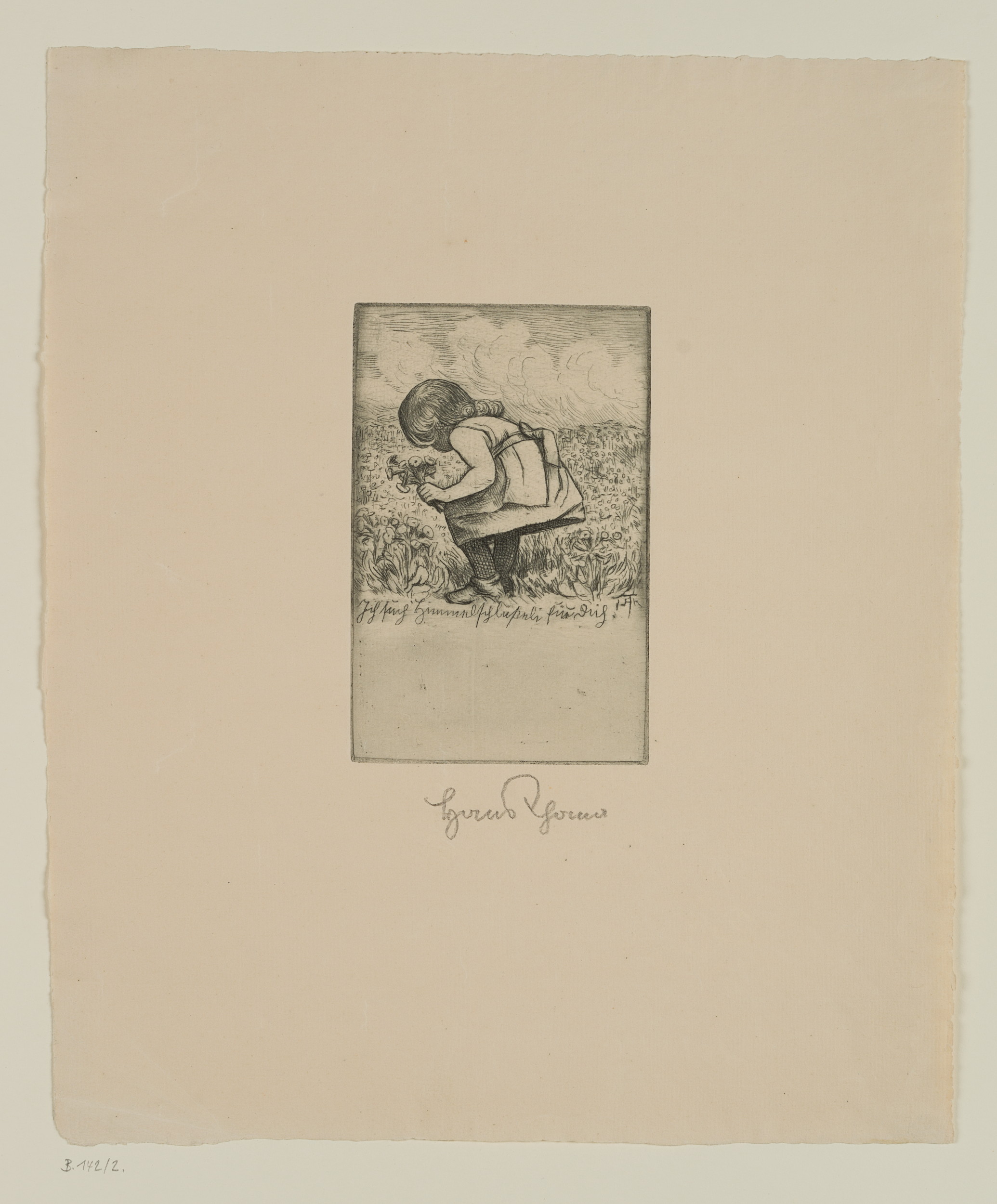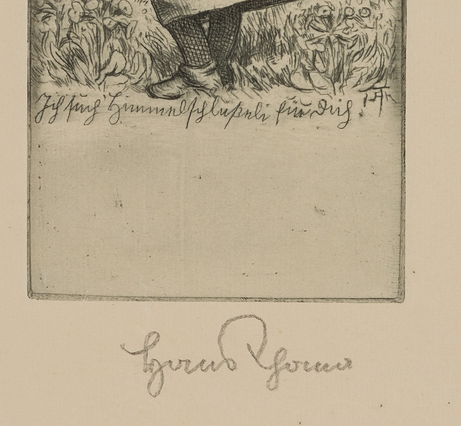 - Inscription: Lower middle signed: „Hans Thoma“. At the center inscribed in the printing plate: „Ich such Blummenschlüßelchen für dich. HT“.