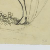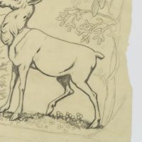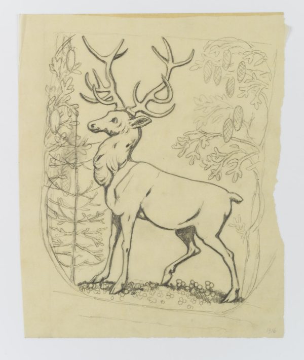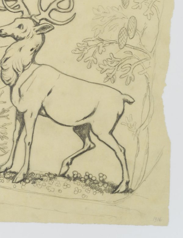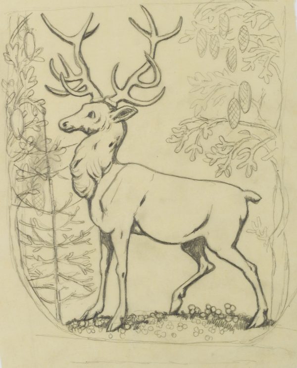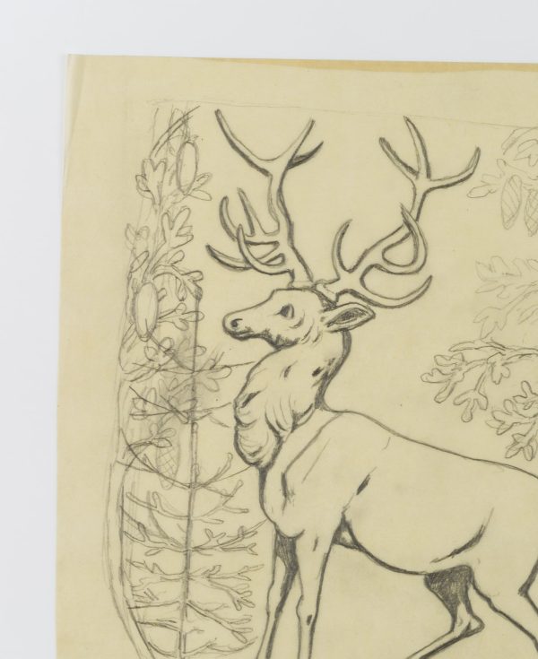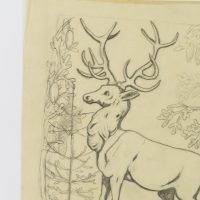 - Beschreibung: Dargestellt ist ein nach links schreitender Hirsch mit prächtigem Geweih. Ihn rahmt Tannengrün mit daran hängenden Zapfen. Dieses und weitere der eingstellten Werke stammen aus einer Skizzenmappe aus dem persönlichen Nachlass von Hans Thoma.