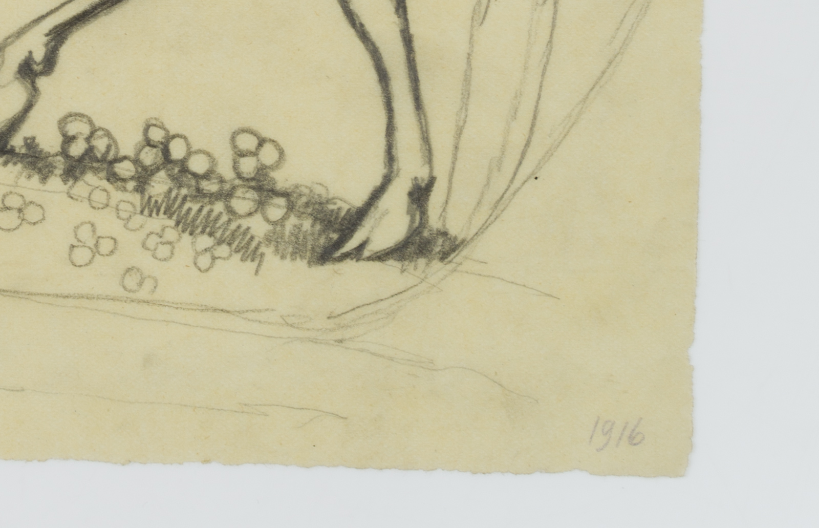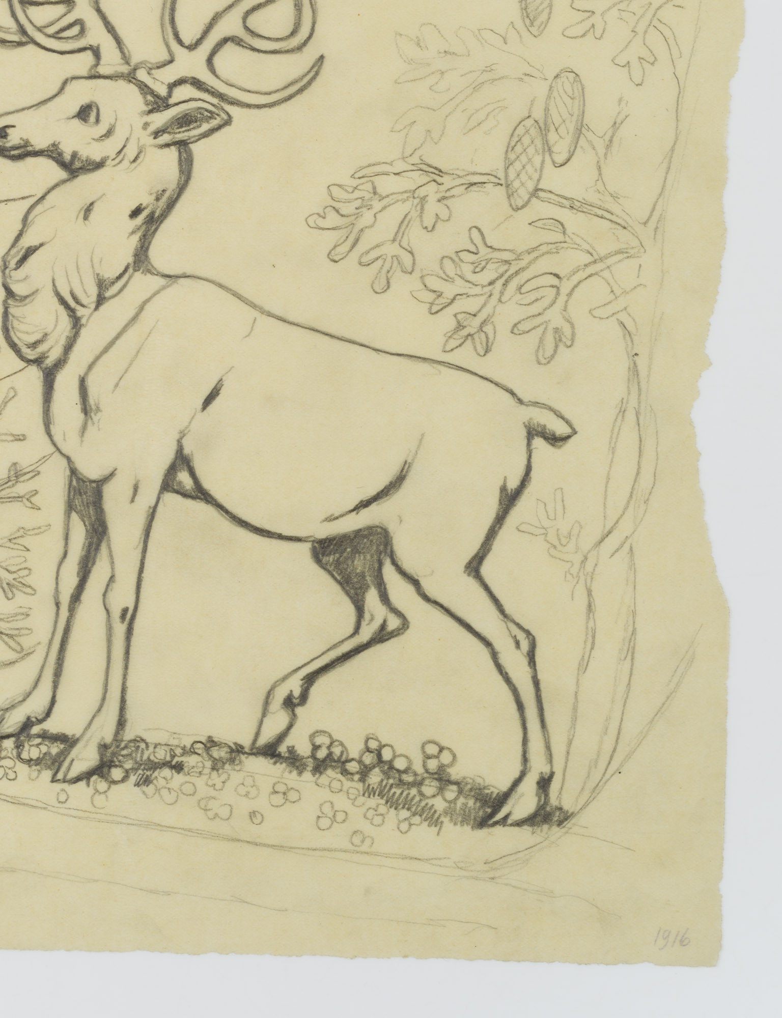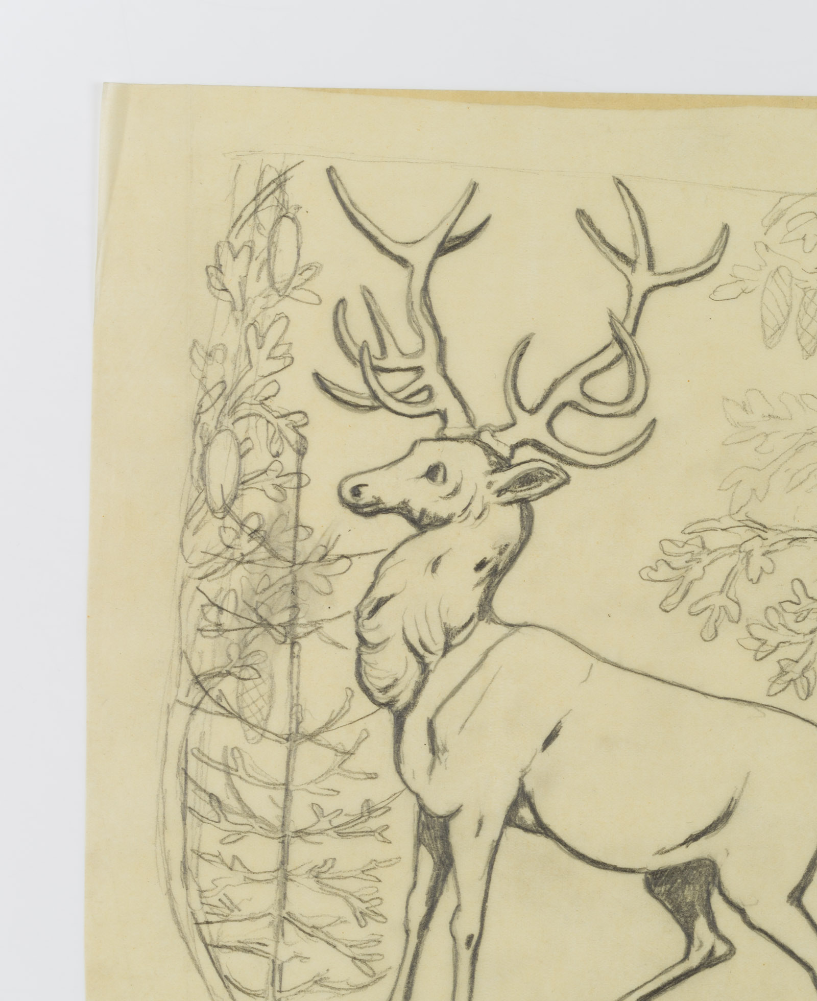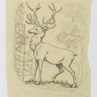 - Description: Depicted is a stag striding to the left with magnificent antlers. He is framed by fir greenery with cones hanging from it. This and other works in the exhibition come from a sketchbook from the personal estate of Hans Thoma.
