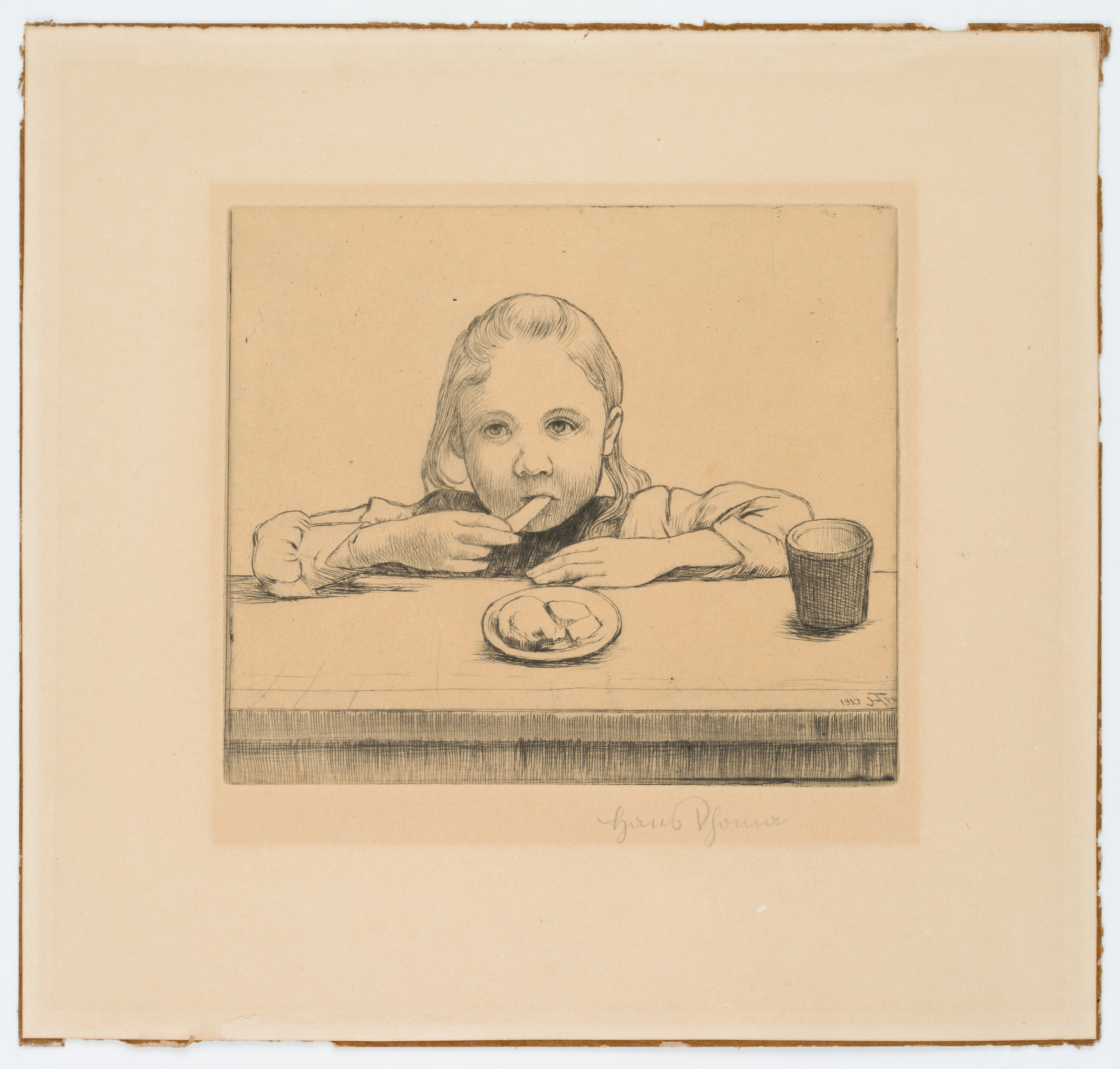 Hans Thoma (1839 Bernau – 1924 Karlsruhe), Kind beim Frühstück, 1910, Radierung