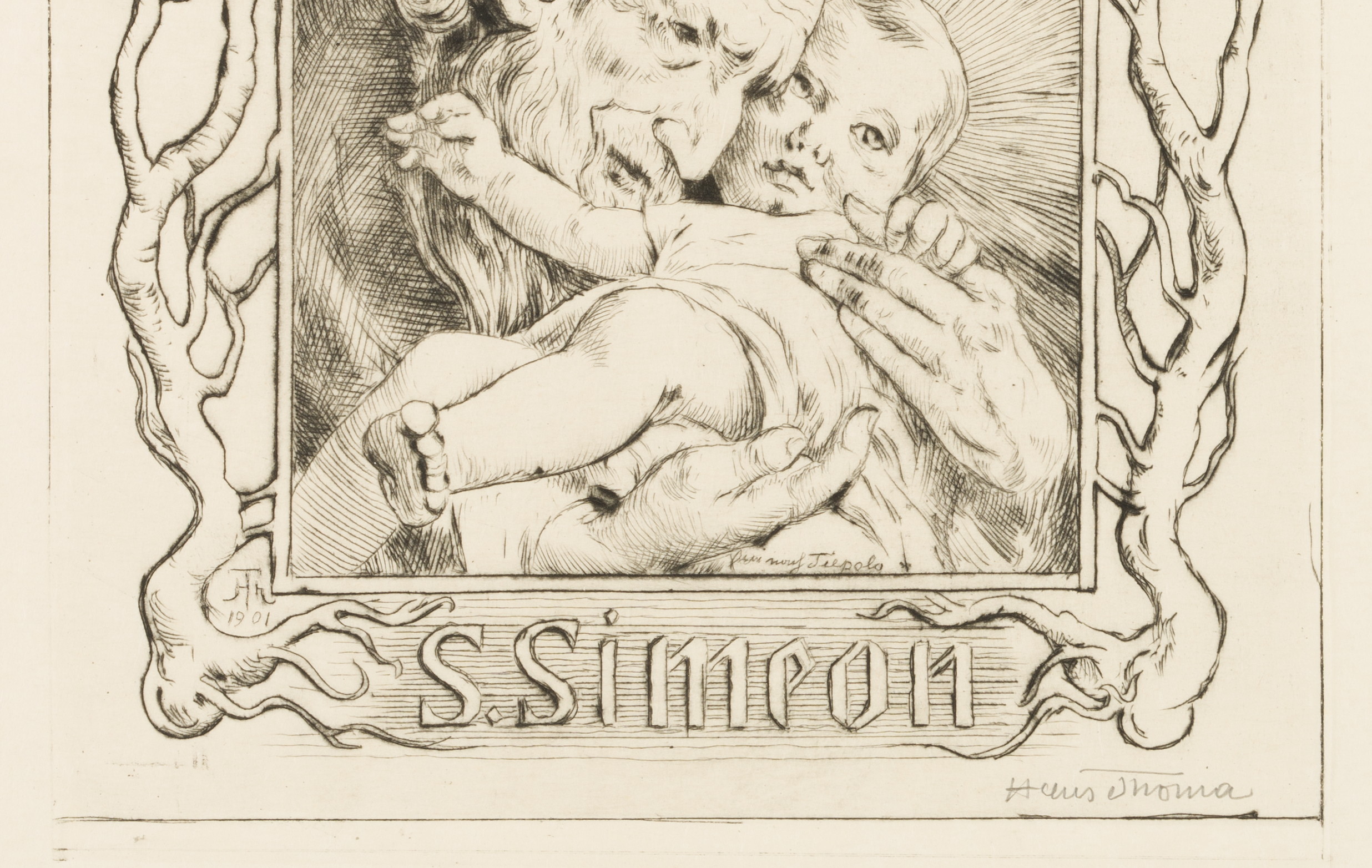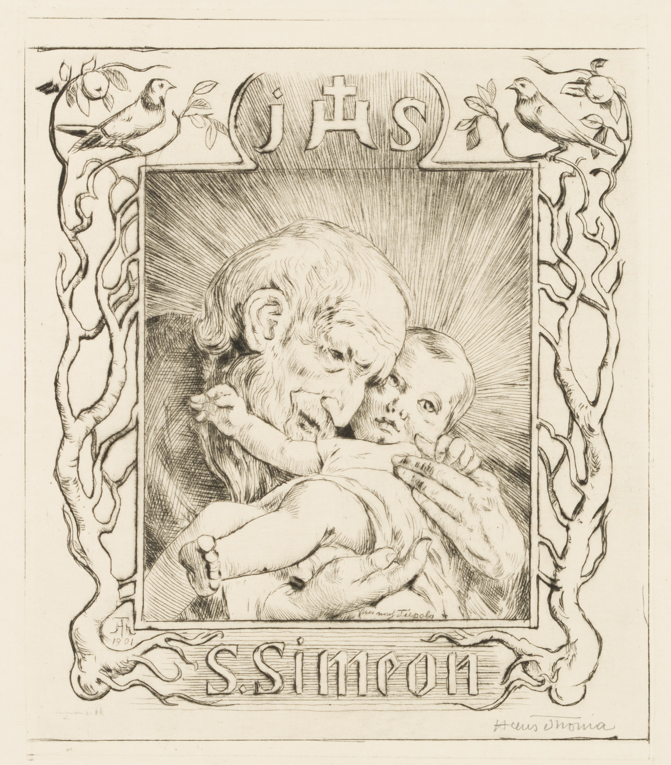 - Inscription: Lower right signed: “Hans Thoma”, links im Druck monogrammiert: “Hth”. Inscribed in the printing plate: “IHS / S.Simeon / frei nach Tiepolo”. lower left dated: “1901”.