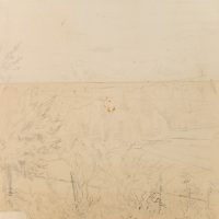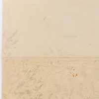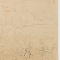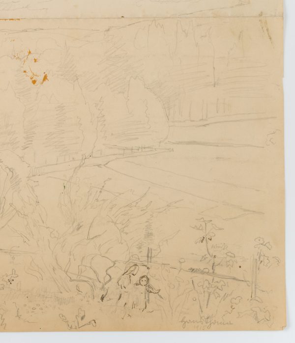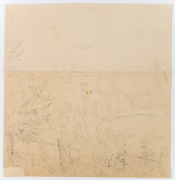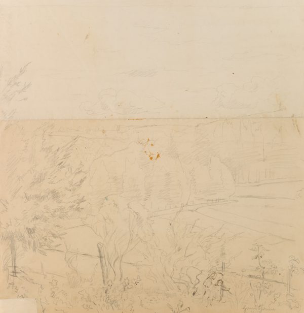 - Beschreibung: Große, recht ausführliche Darstgellung der hügeligen, bewaldeten Landschaft mit Feldern und Zäunen unter einem mild bewölkten Himmel. Dieses und weitere der eingstellten Werke stammen aus einer Skizzenmappe aus dem persönlichen Nachlass von Hans Thoma. | Wasserzeichen: “GEBRÜDER BUHL ETTLINGEN 3a NORMAL 3a”