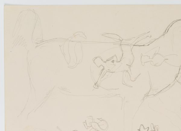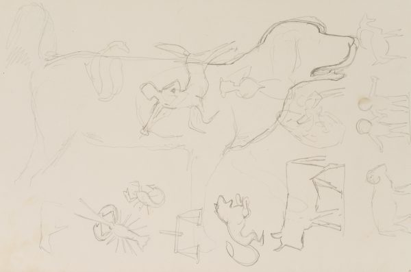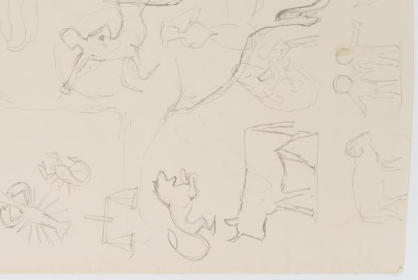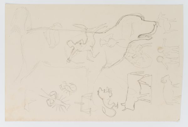 - Beschreibung: Neben einer größeren Darstellung einer Hundesilhouette finden sich hier verschiedene Studien zu Sternzeichen, so zwei Fische, ein Zwillingspaar, ein Kentaur/Schütze, Skorpion und Krebs, Waage, Stier, Steinbock, Jungfrau (mit Kind), Löwe und Wassermann. Dieses und weitere der eingstellten Werke stammen aus einer Skizzenmappe aus dem persönlichen Nachlass von Hans Thoma.