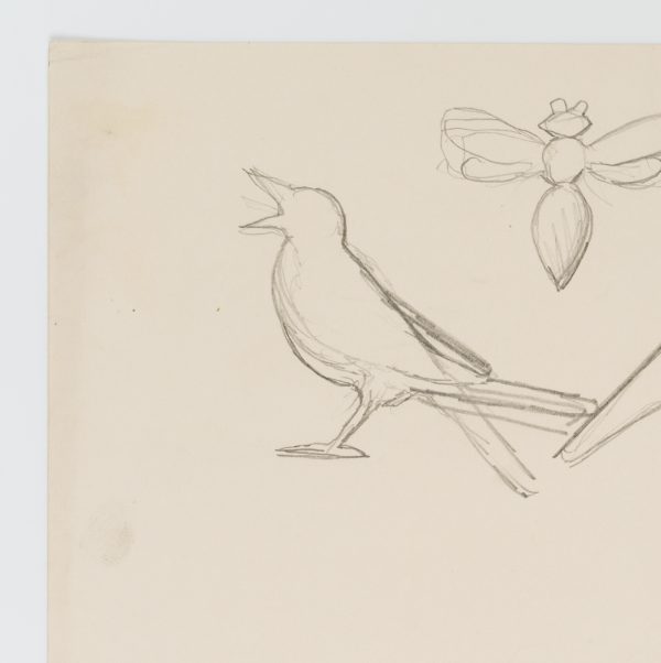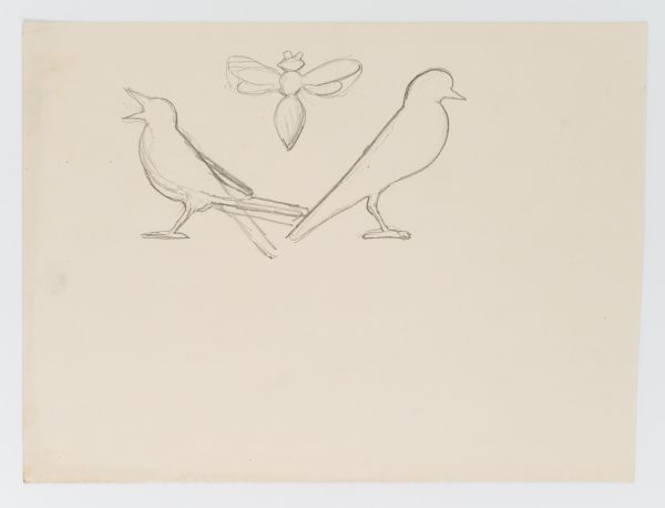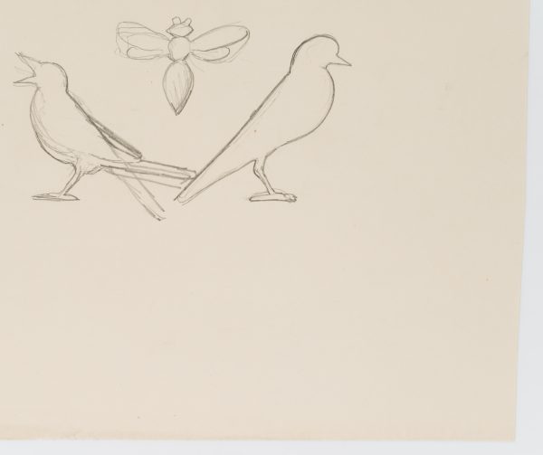 - Beschreibung: Zwischen einer singenden und einer schweigenden Vogelgestalt im Profil zentriert Thoma den Körper einer Wespe mit gespreizten Flügeln. Die kräftig nachgezogenen Konturlinien dienten wohl für die spätere Übersetzung in Drucktechniken oder Übertragung in ein (Wand-) Gemälde.Dieses und weitere der eingstellten Werke stammen aus einer Skizzenmappe aus dem persönlichen Nachlass von Hans Thoma.