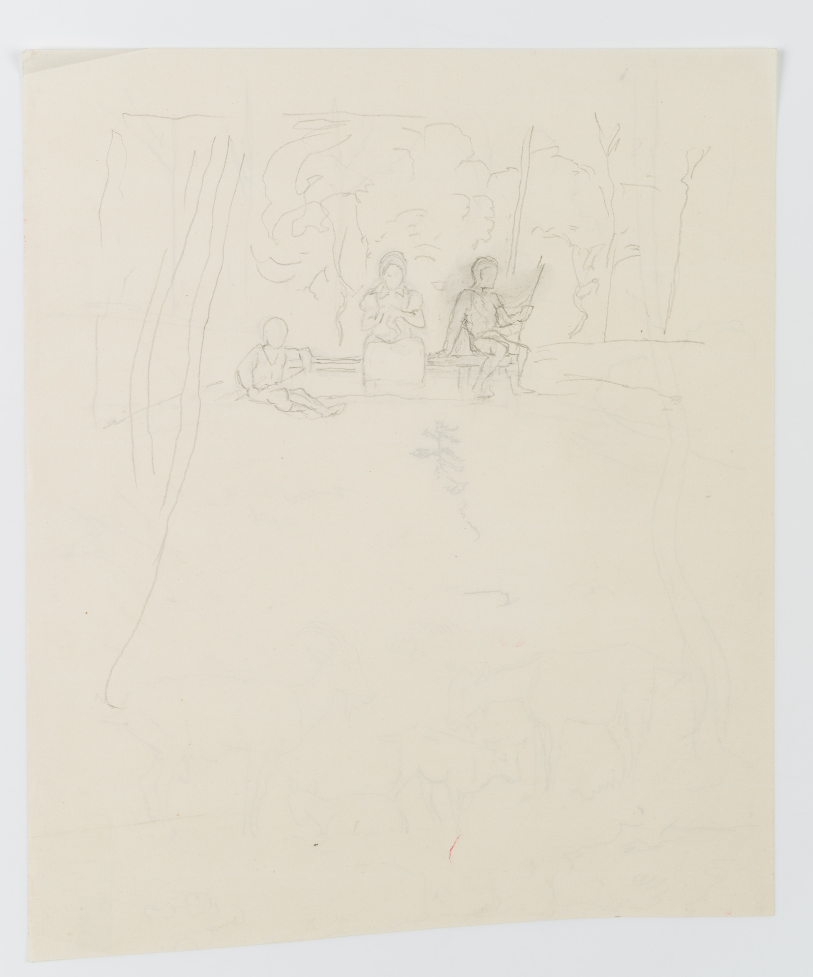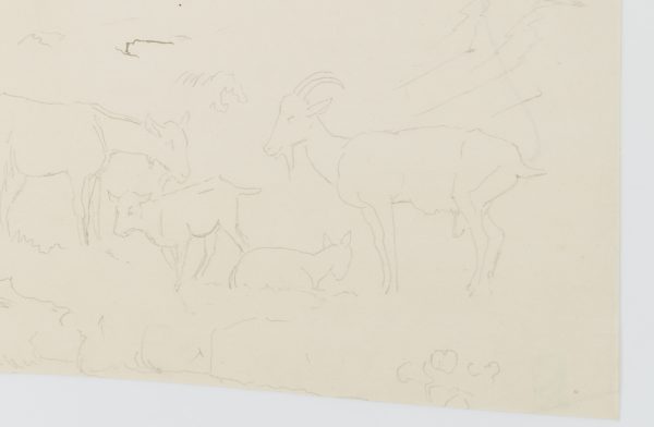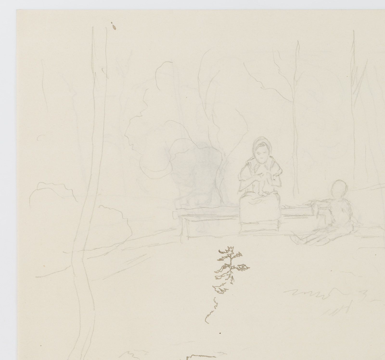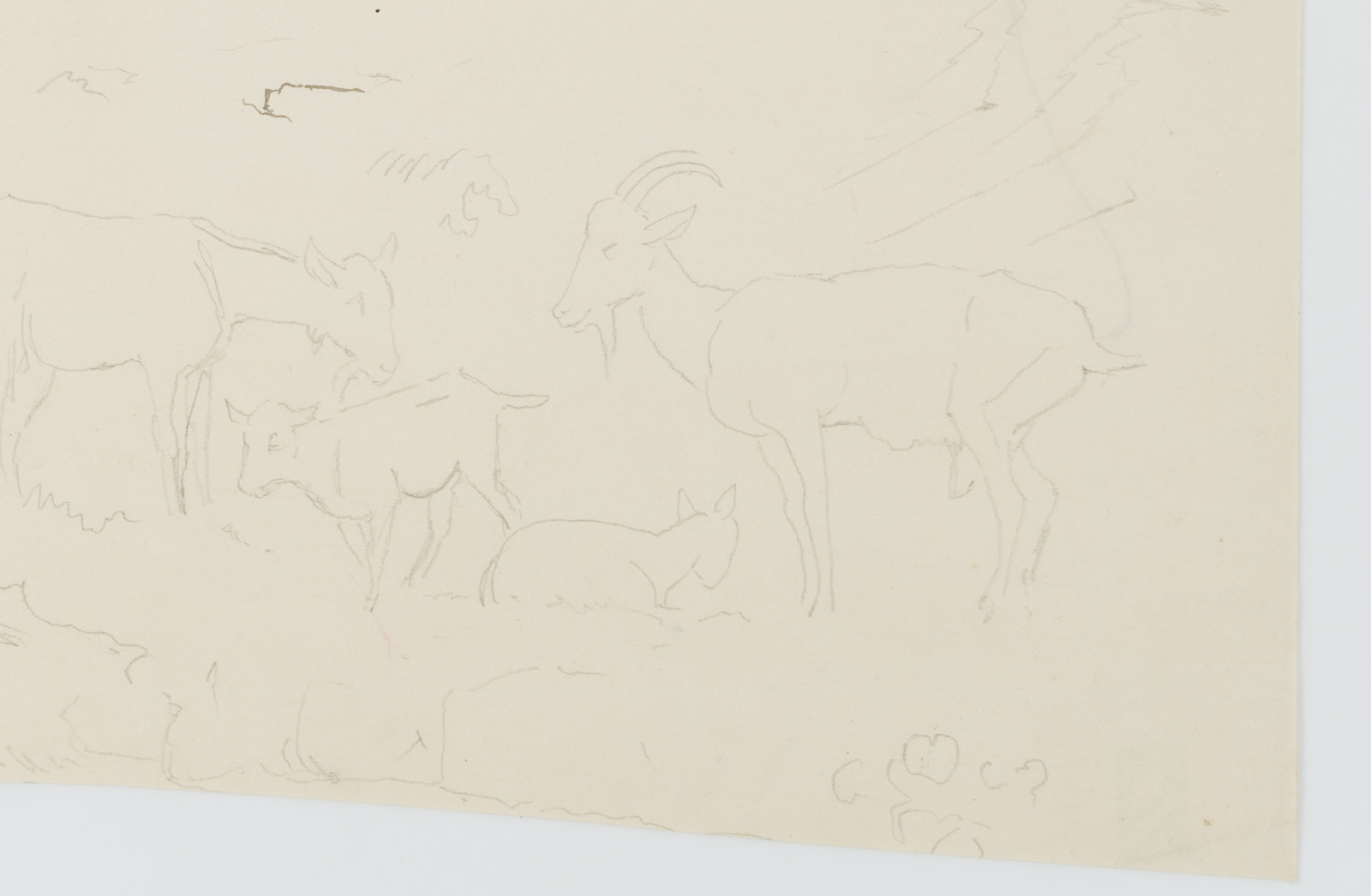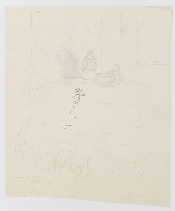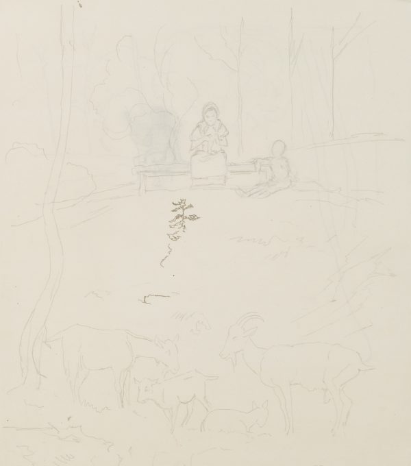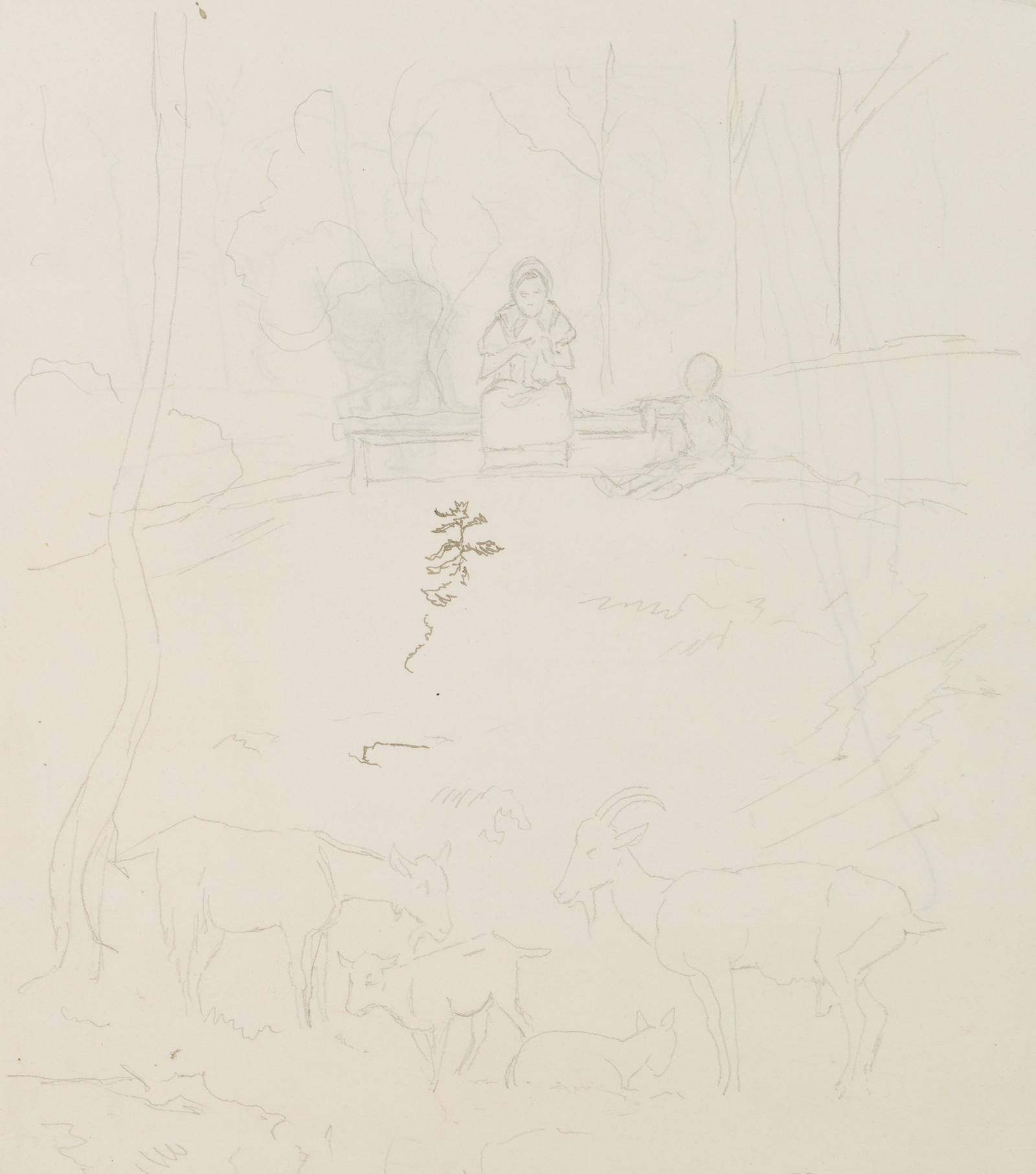 - Description: The mother sits knitting on a bench, the boy on the ground to the right. In the foreground the goats are frolicking. In the drawing on the reverse, Thoma has added the figure of a shepherd, also sitting on the bench, to the group of two of mother and boy; furthermore, the boy here, like the shepherd, is holding a staff in his hands. This and other works in the exhibition come from a portfolio of sketches from the personal estate of Hans Thoma.
