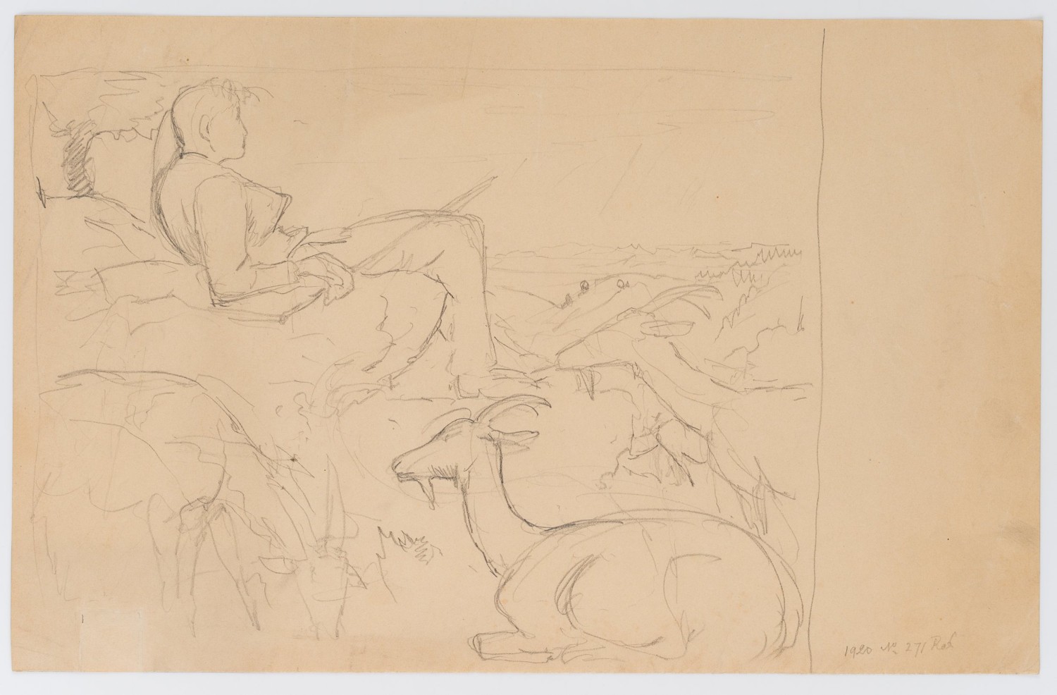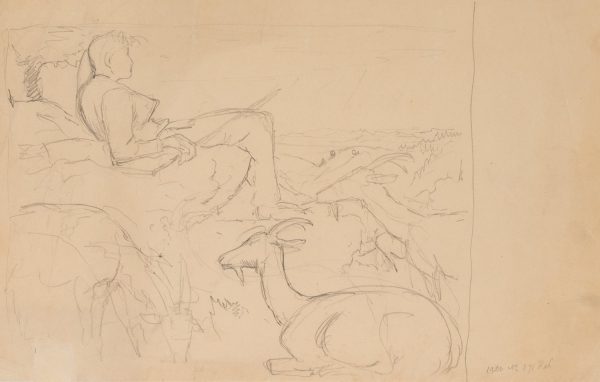 - Description: Wonderfully relaxed sketch of a shepherd gazing into the distance, resting in the circle of his peacefully grazing animals.
