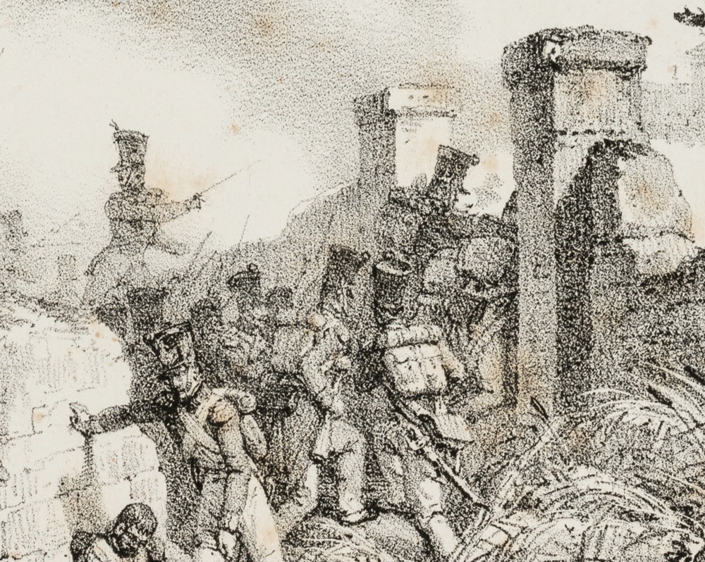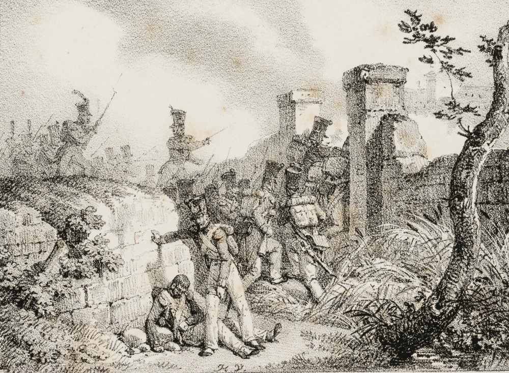 Schlachtenbild des berühmten französischen Historien- und Militärmalers Vernet. Zeigt eine Gruppe napoleonischer Infanteriesoldaten beim Sturm durch einen Graben auf ein Tor in einer Mauer.