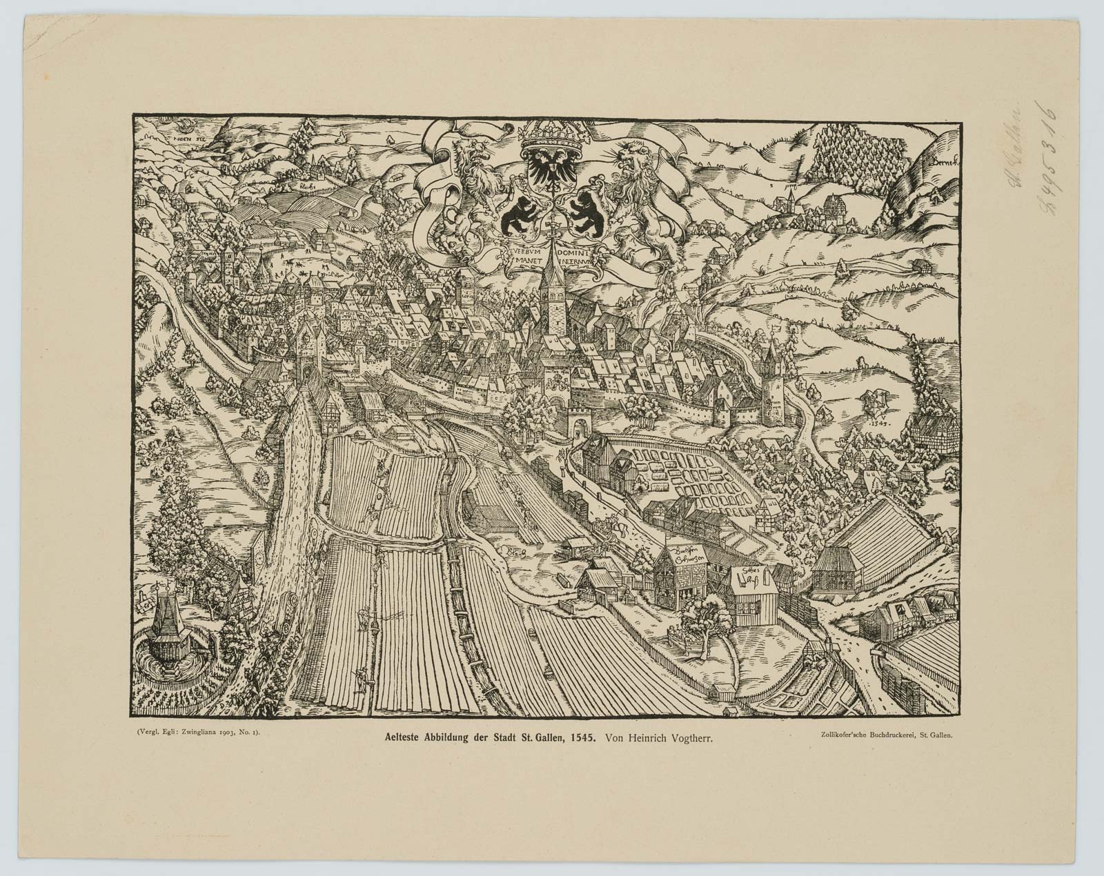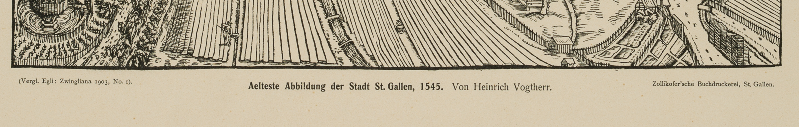 - Bezeichnung: Unterhalb beschriftet mit “Aelteste Abbildung der Stadt St. Gallen, 1545. Von Heinrich Vogtherr”. Links daneben beschriftet mit “(Vergl. Egli: Zwingliana 1903, No. 1).”.