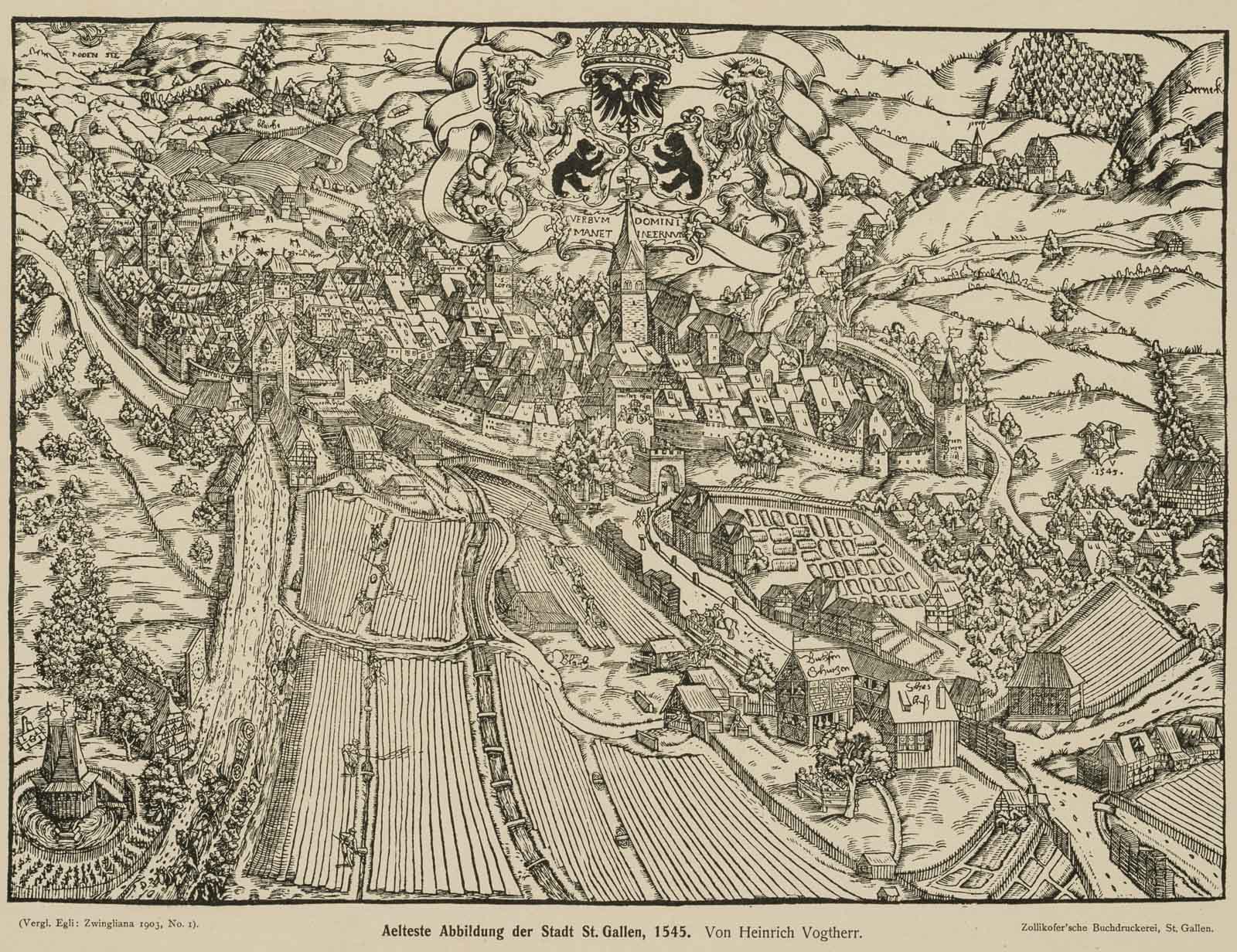- Description: The sheet of this both picturesque and topographical view of St. Gall comes from the book “Zwingliana” by Egli, published in 1903.