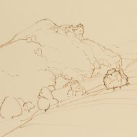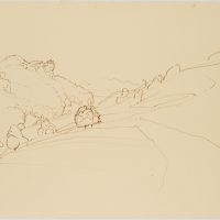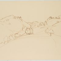 - Description: Without designation. View of a landscape with a hill in the foreground and numerous trees on its crest. In the background another hill limits the view, at the outermost edge of which a prominent rock can be seen. Born in Affeltrangen, Austria, in 1885, Hans WAGNER attended the School of Applied Arts in Munich. In the autumn of 1913 he acquired a patent as a drawing teacher for Switzerland. Numerous sketches, drawings and prints have been preserved, which Wagner produced in a wide variety of media – such as charcoal, watercolour or as woodcuts.
